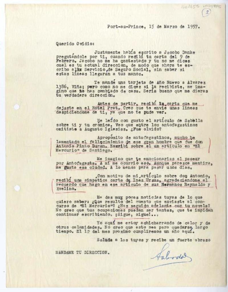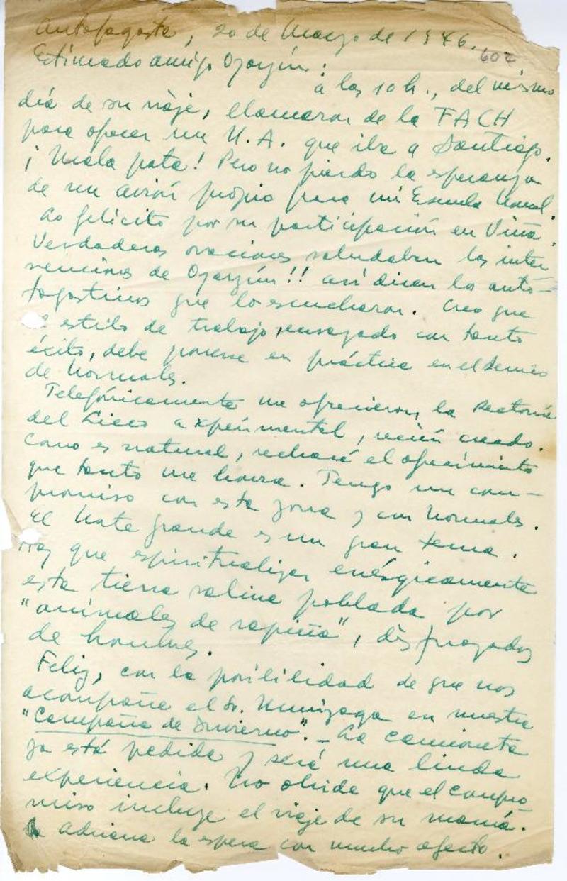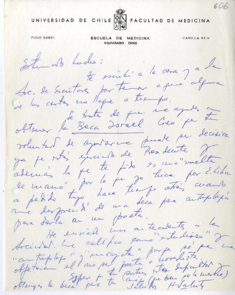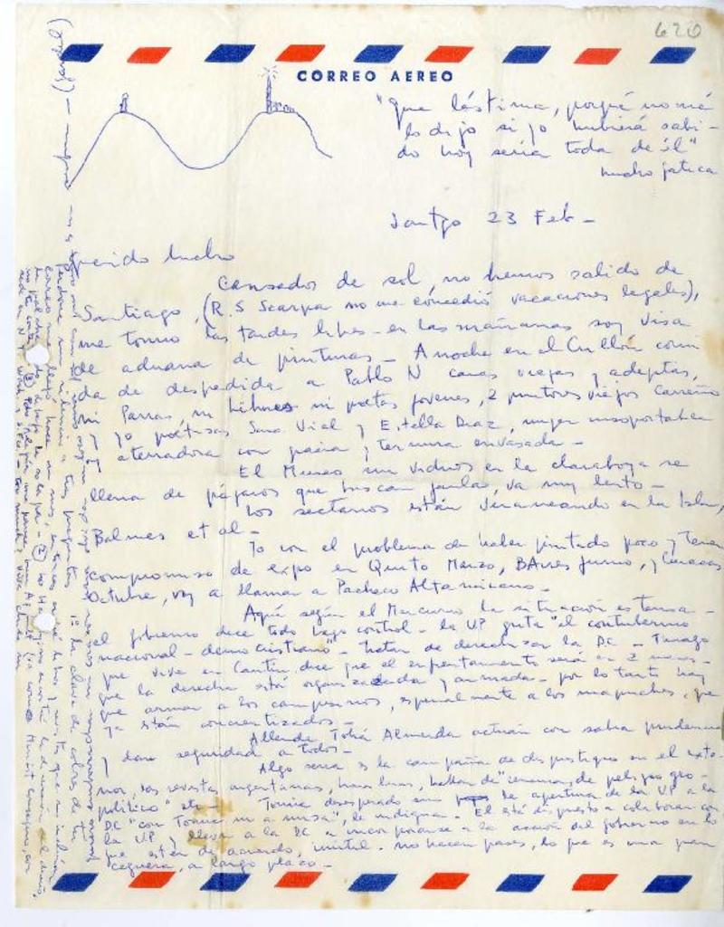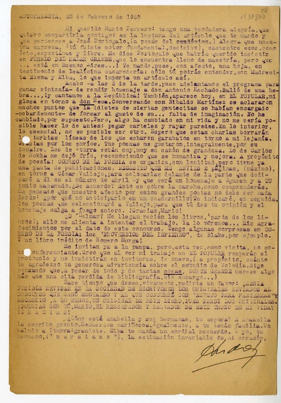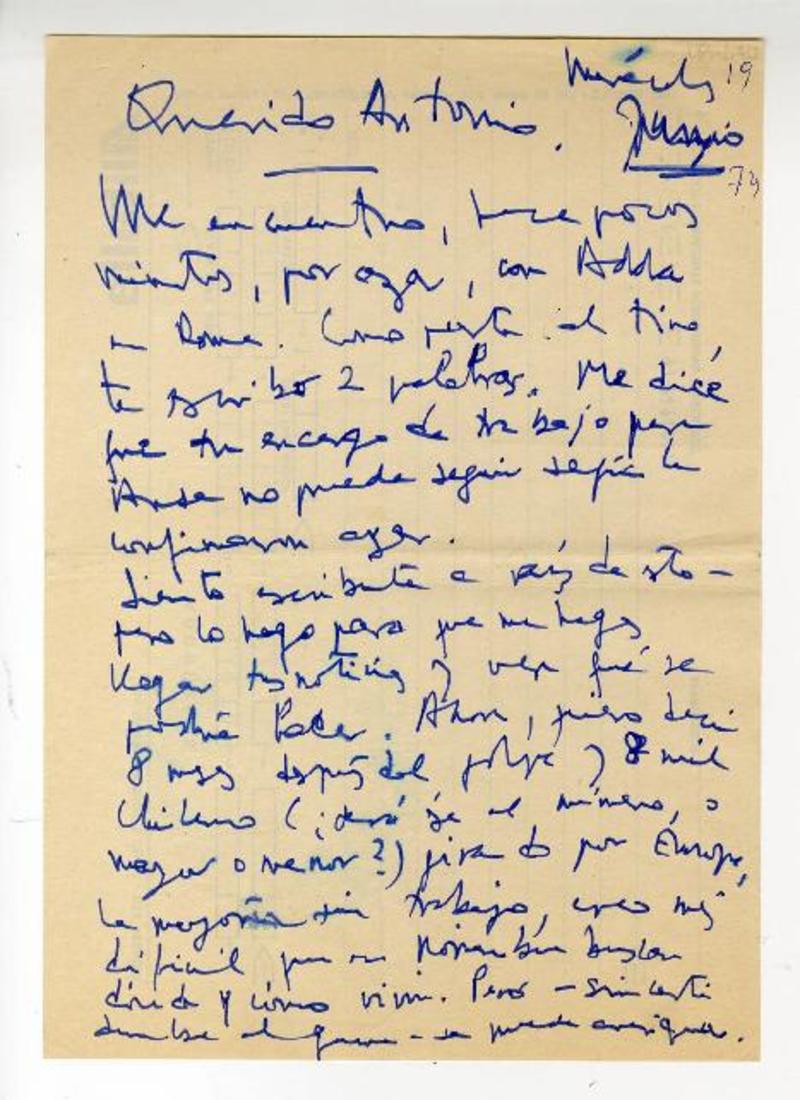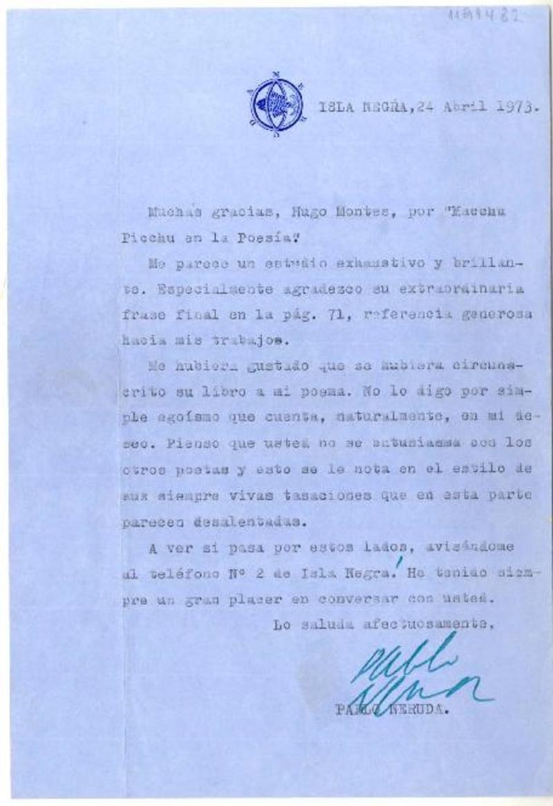 Antofagasta, Chile [a] Hugo Montes Carta, 1973 febrero 9, [manuscrito] Andrés Sabella.