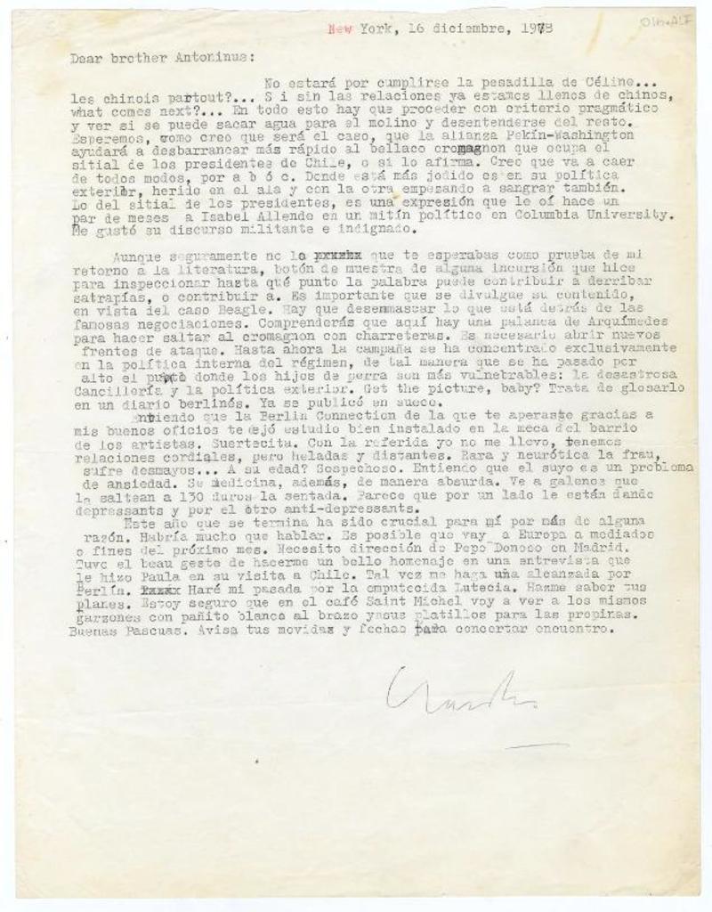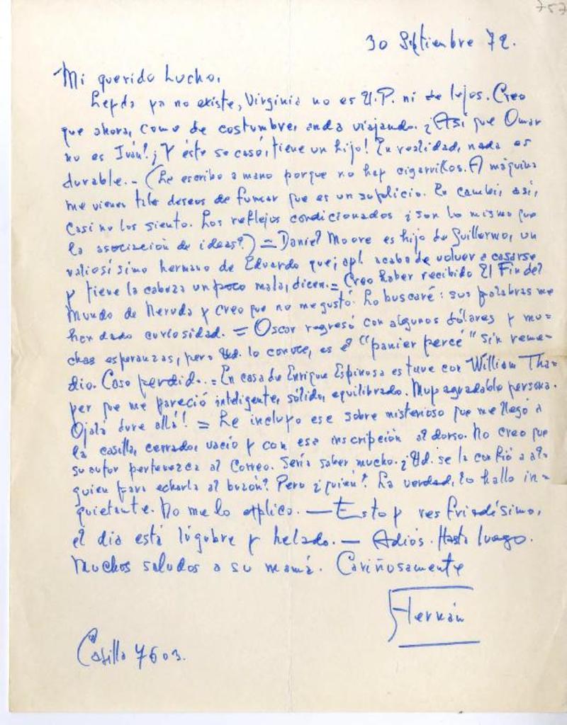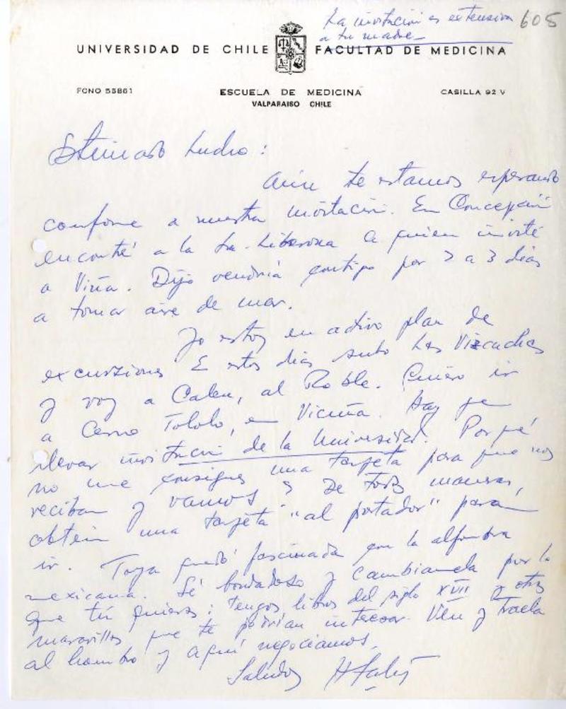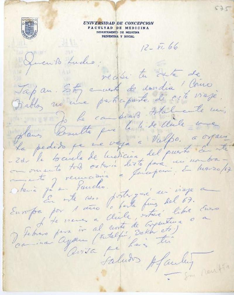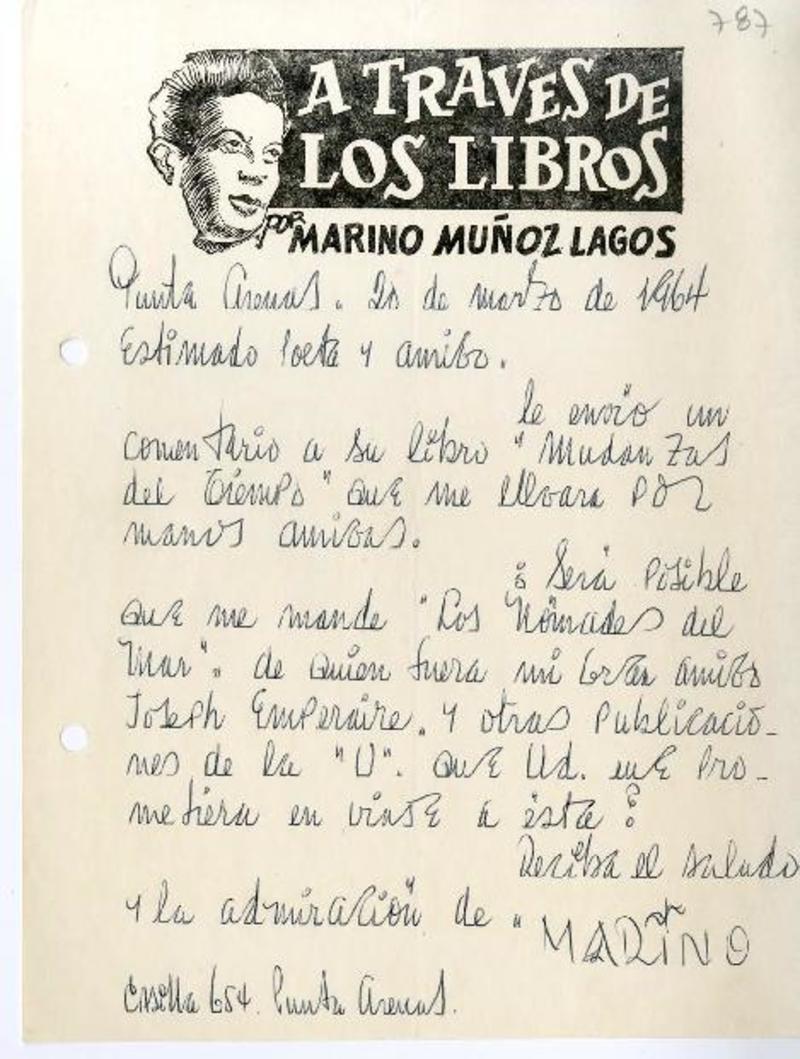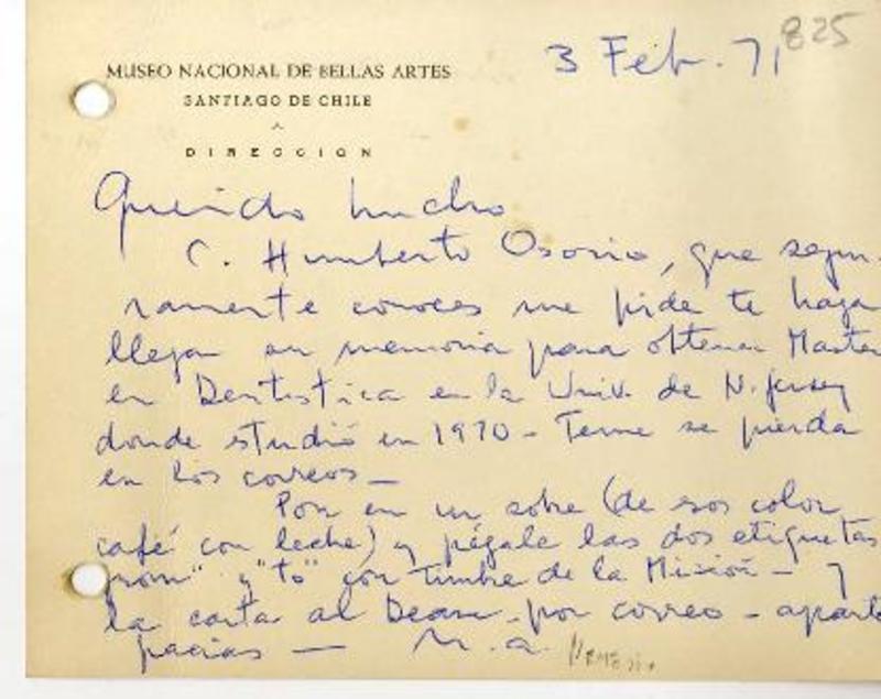 Antofagasta, Chile [a] Hugo Montes Carta, 1973 febrero 9, [manuscrito] Andrés Sabella.