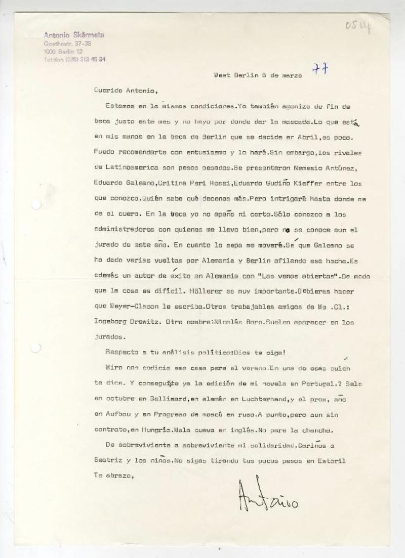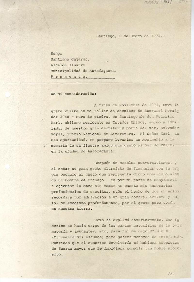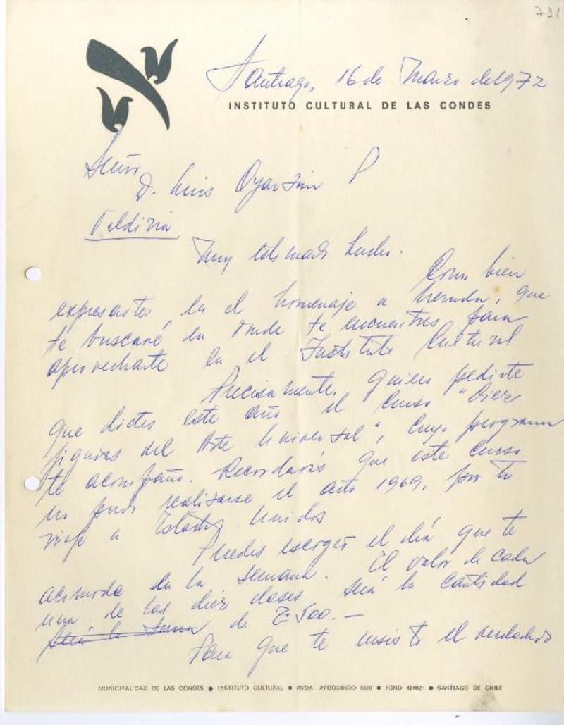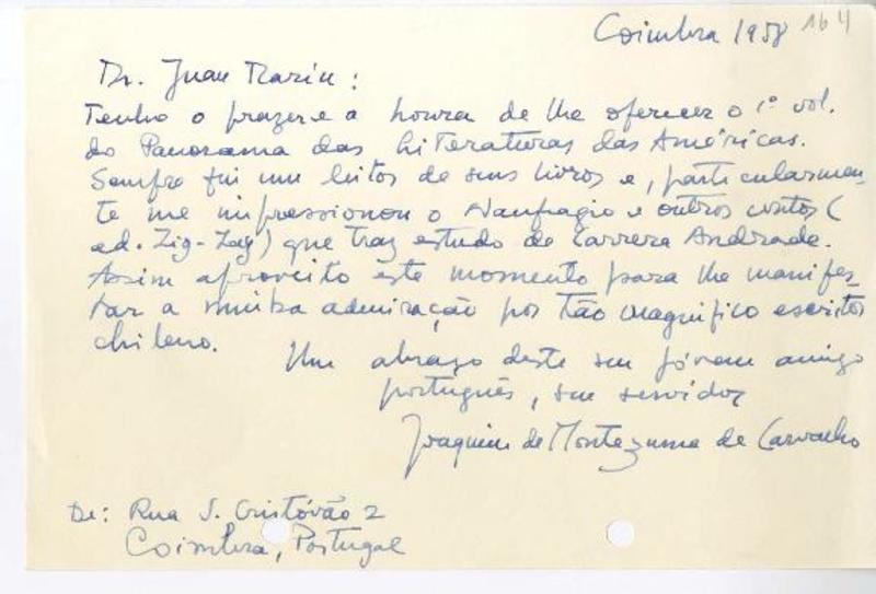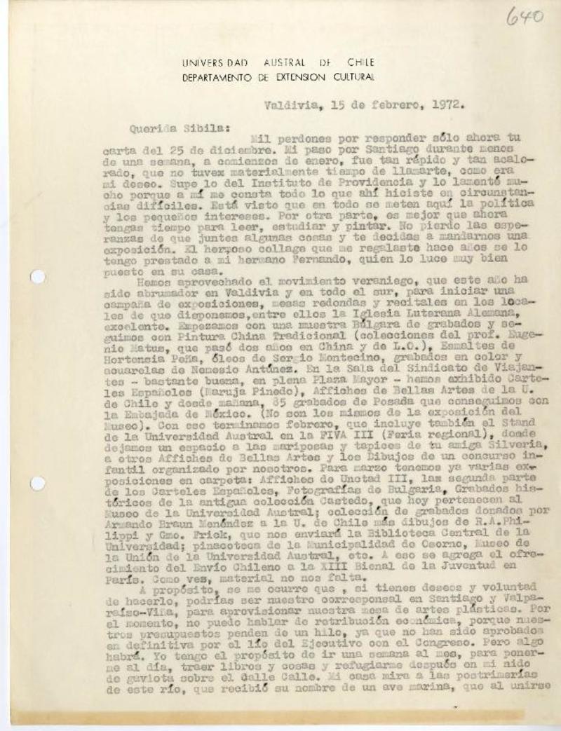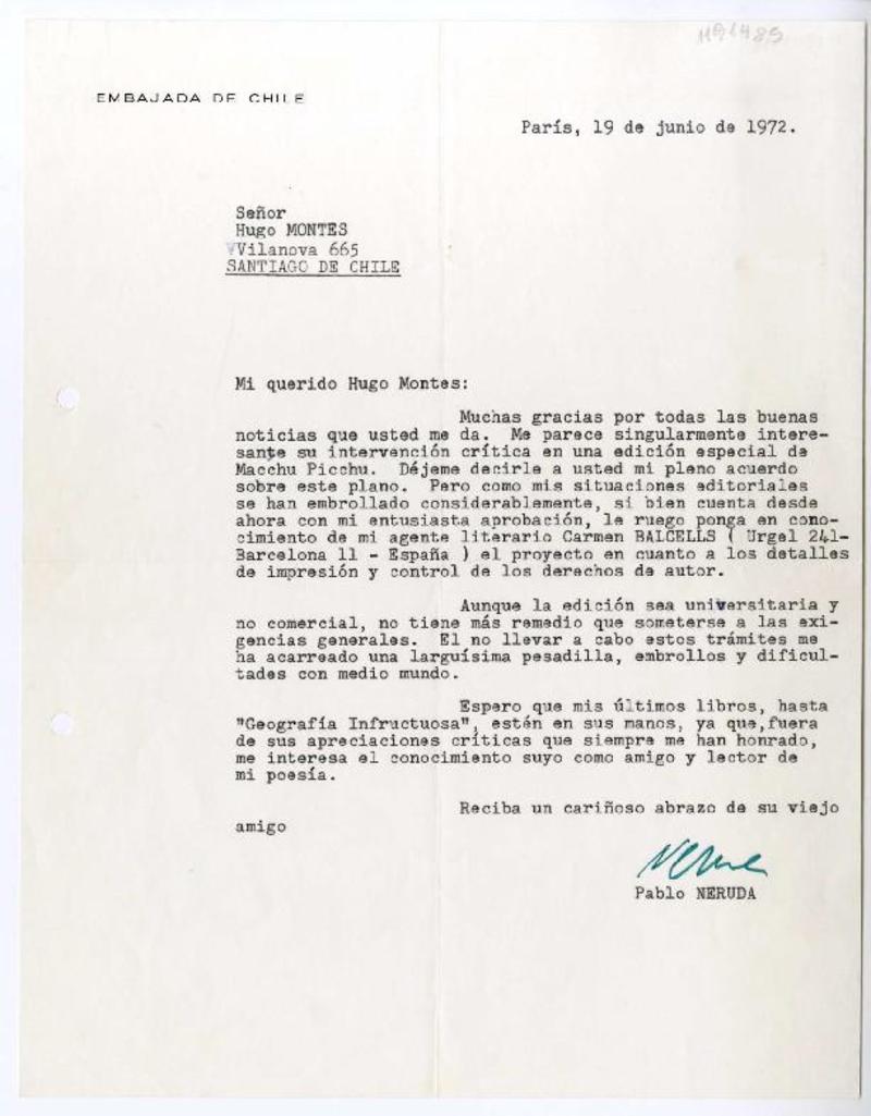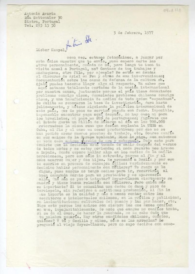 Antofagasta, Chile [a] Hugo Montes Carta, 1973 febrero 9, [manuscrito] Andrés Sabella.