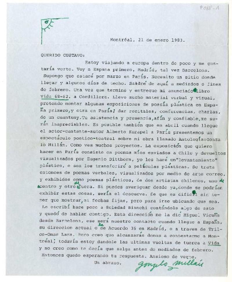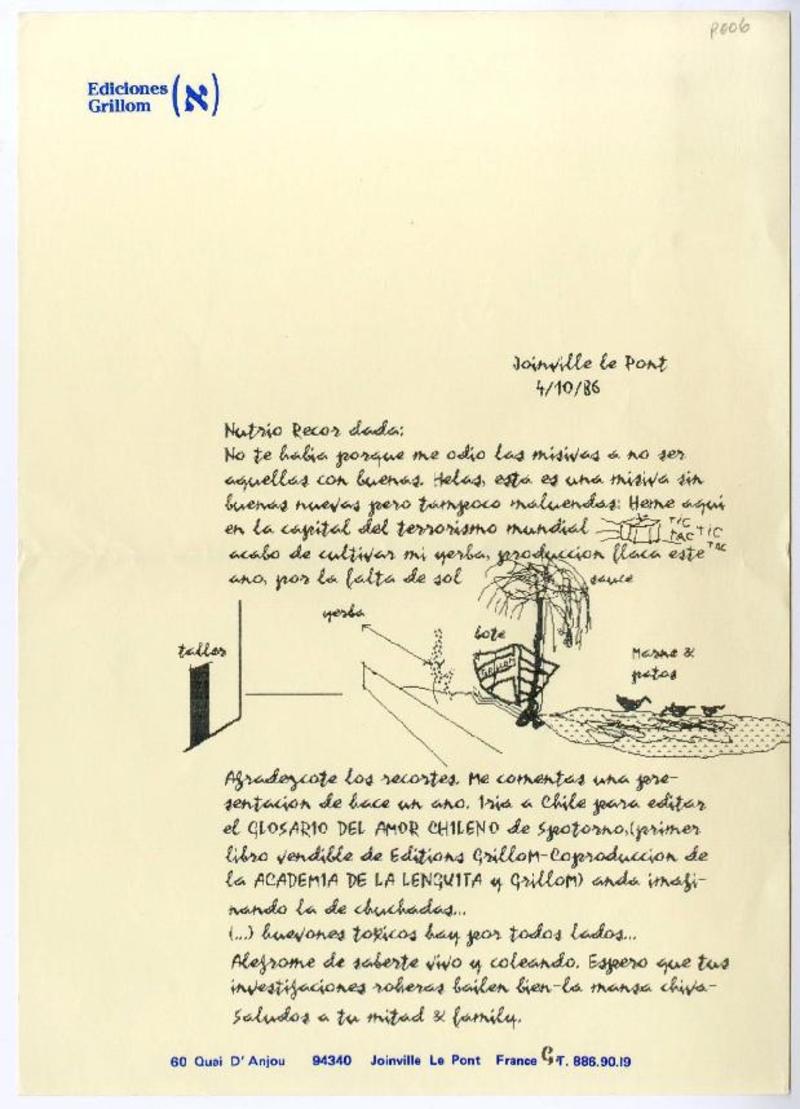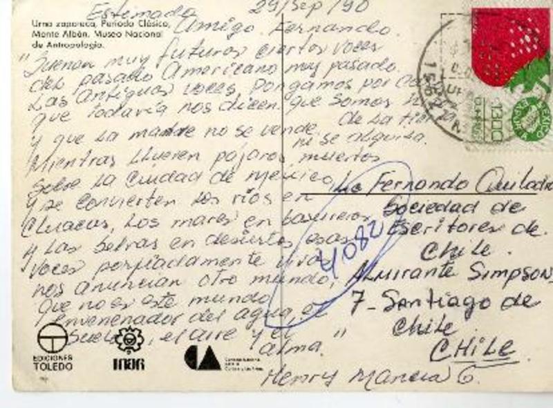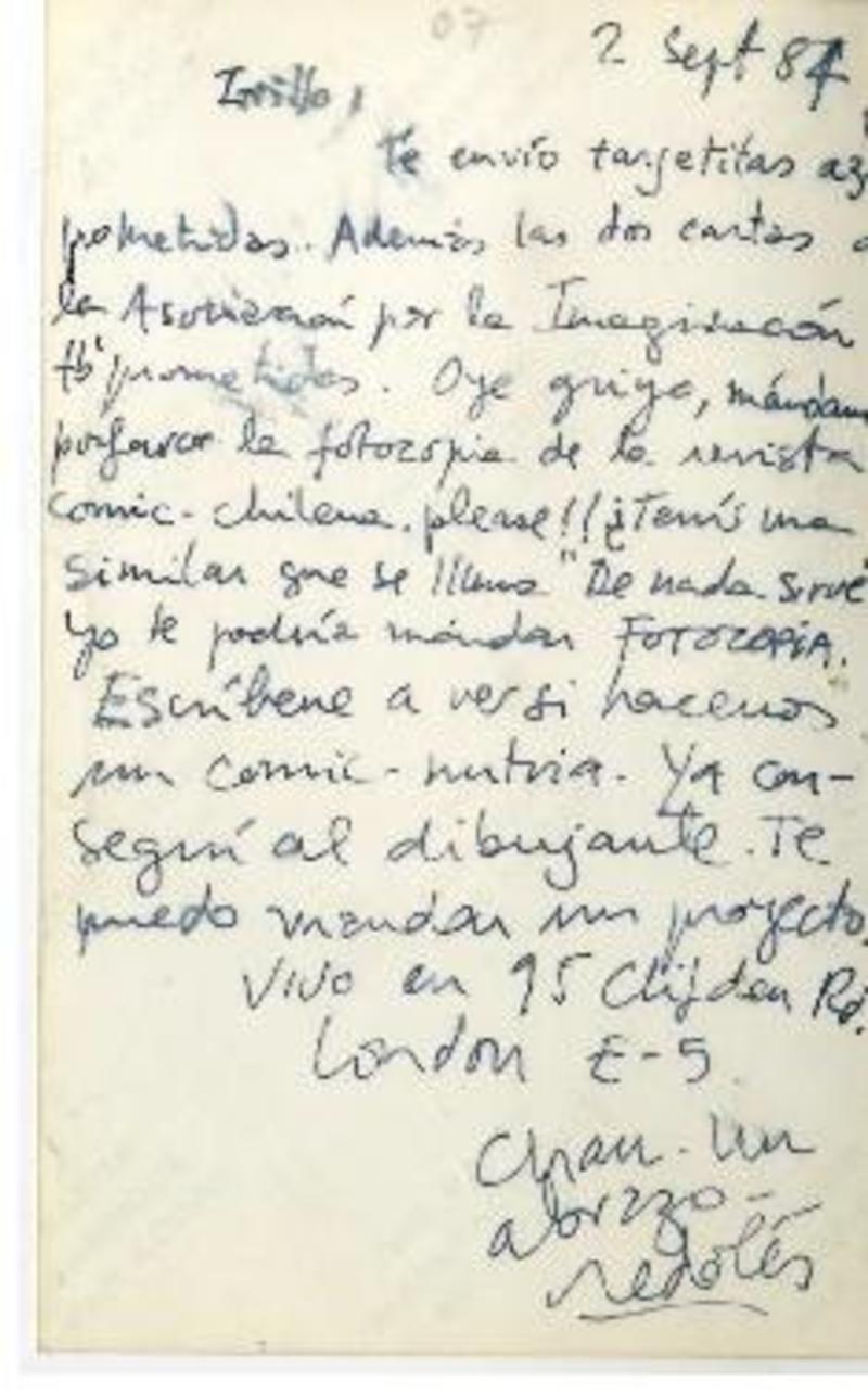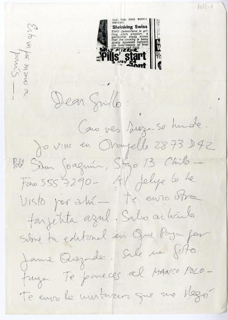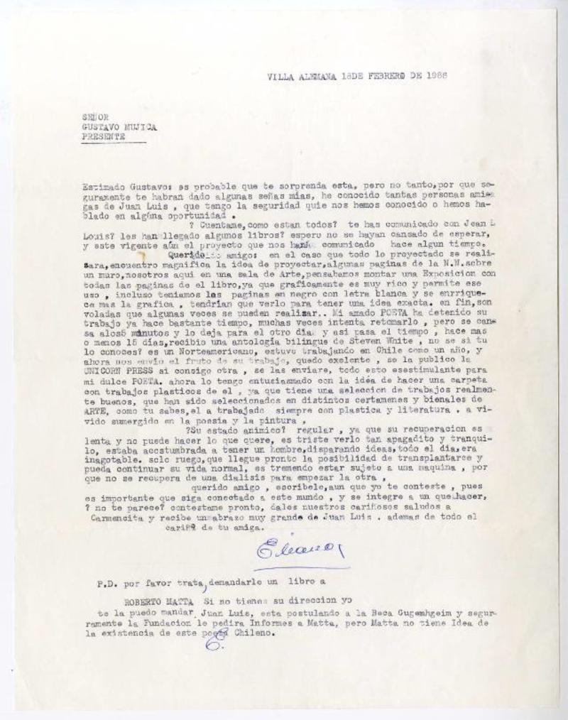 Villa Alemana, Chile [a] Gustavo Mujica Carta, 1986 febrero 18, [manuscrito] Eliana Navarro.