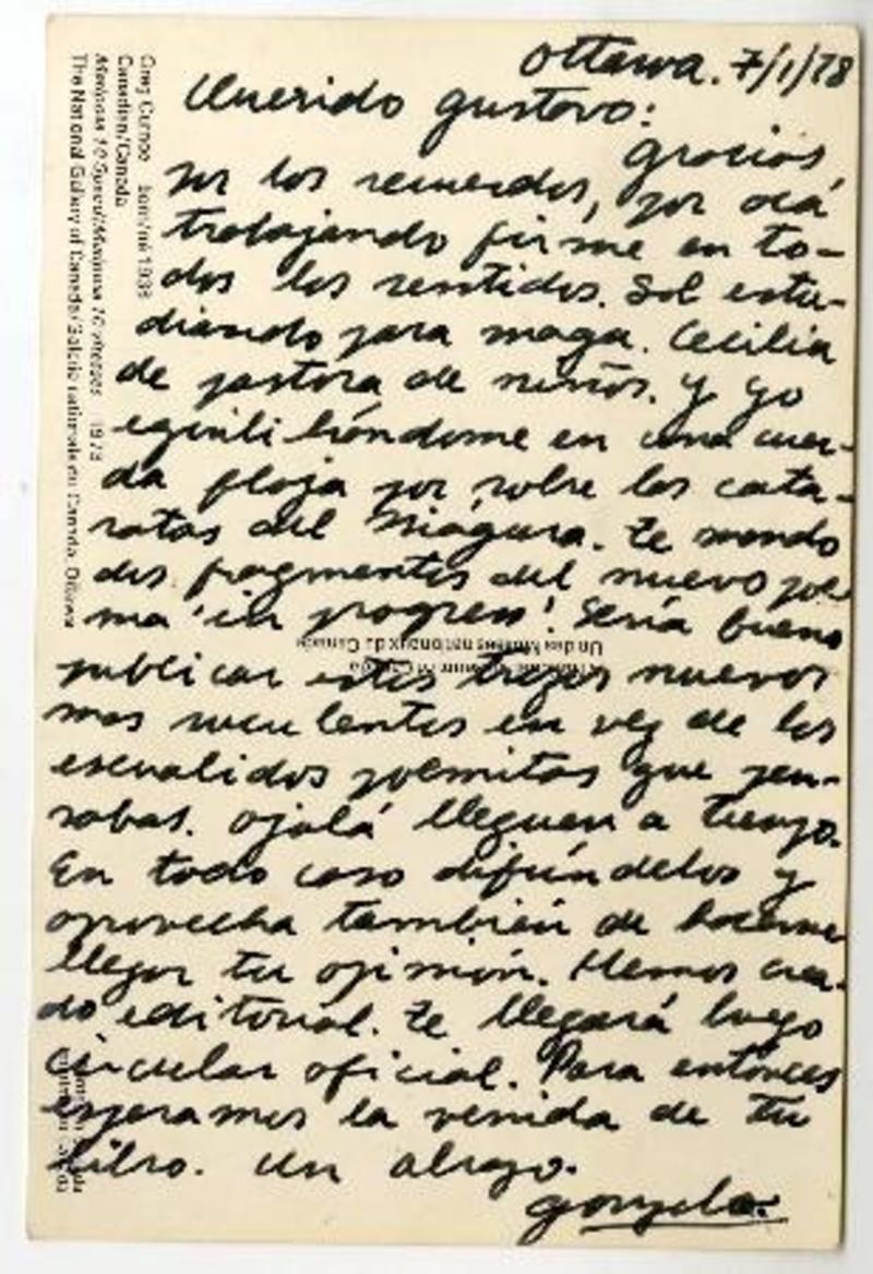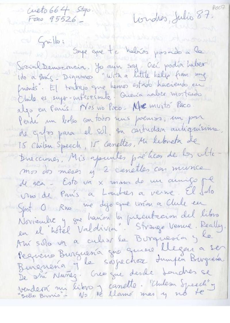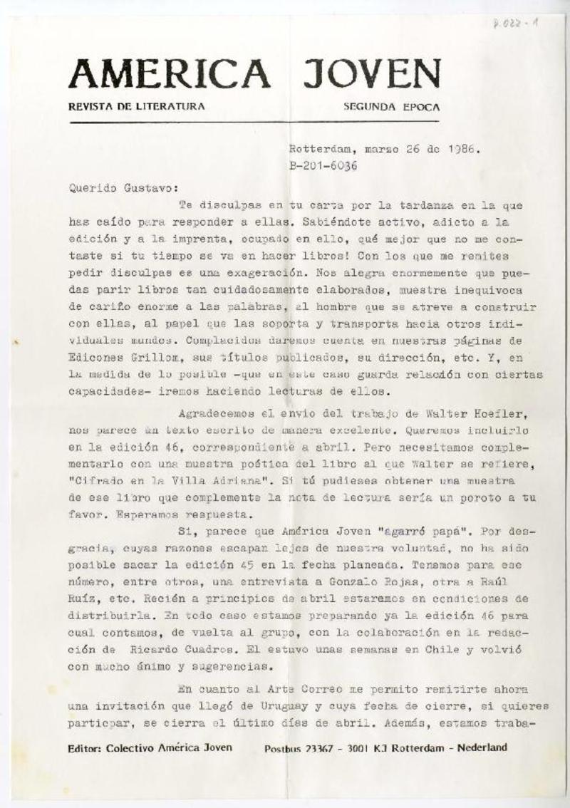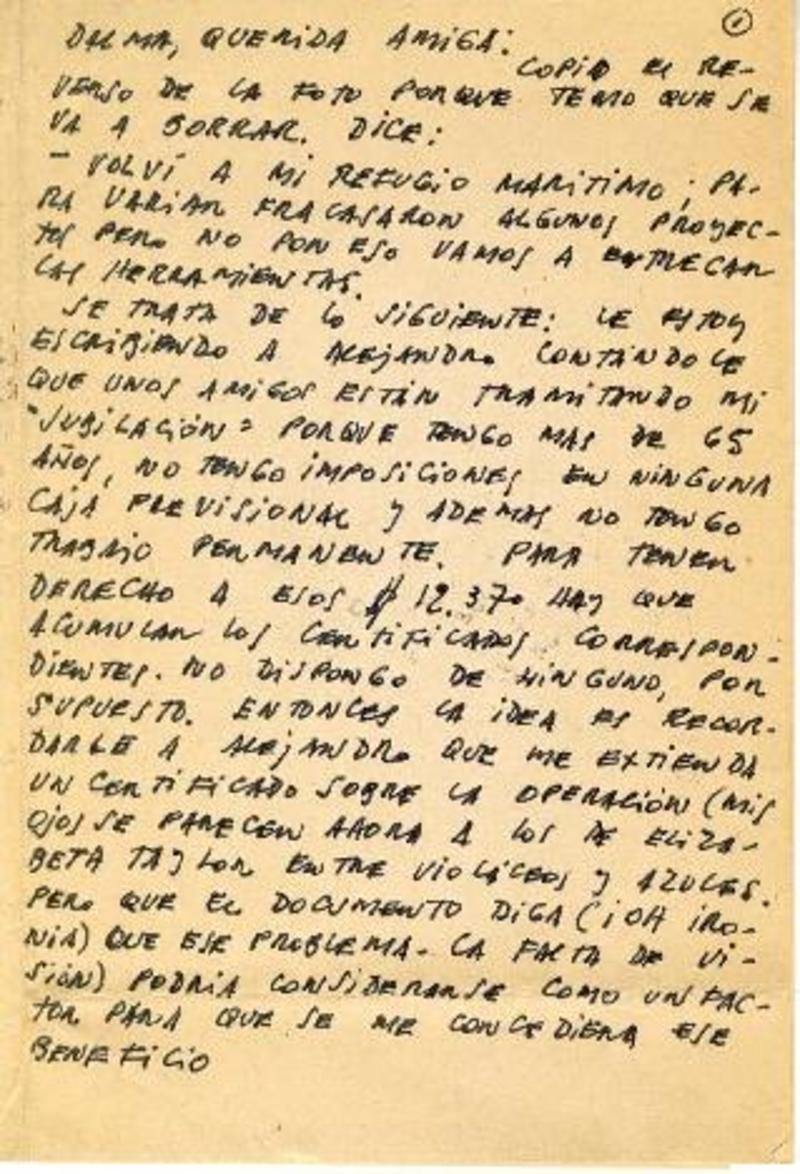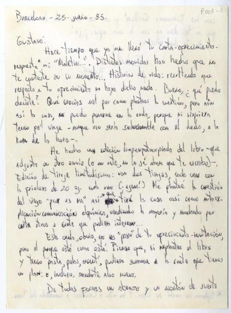 Villa Alemana, Chile [a] Gustavo Mujica Carta, 1986 febrero 18, [manuscrito] Eliana Navarro.