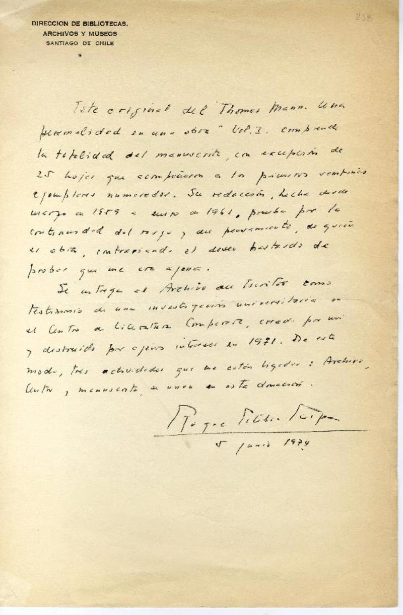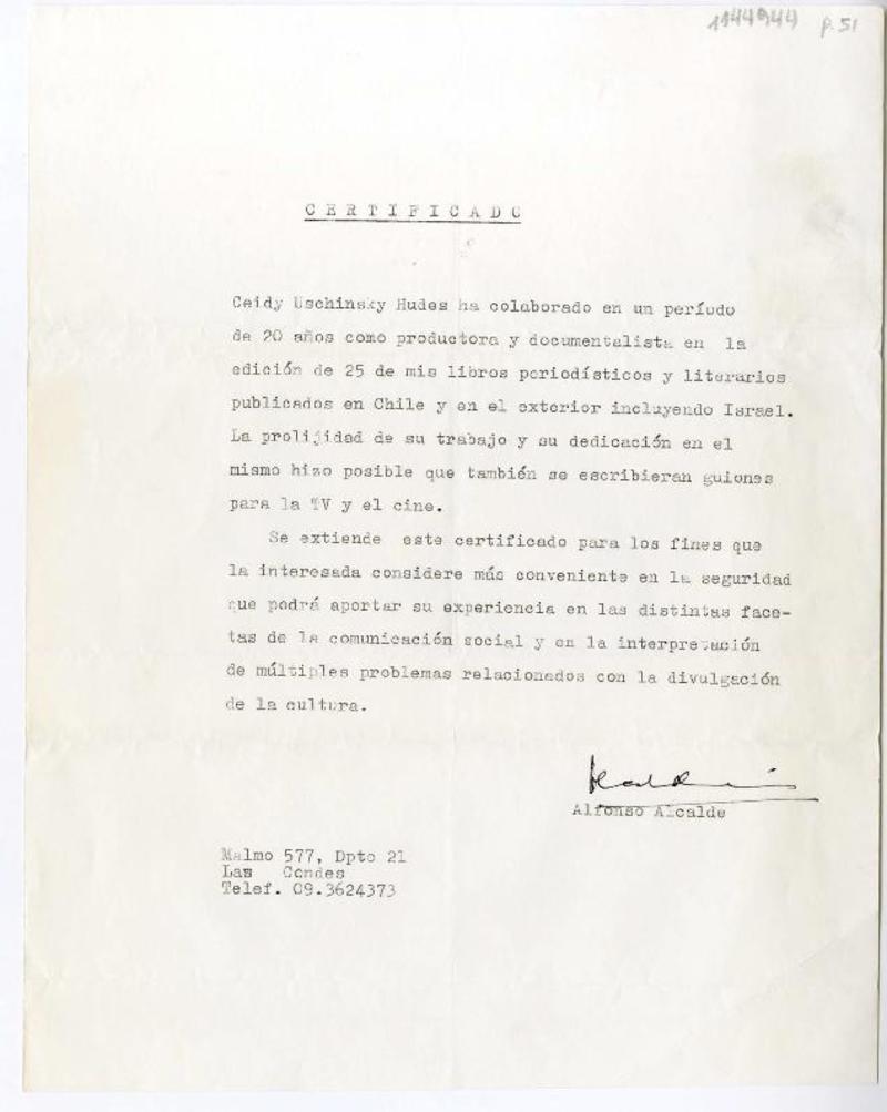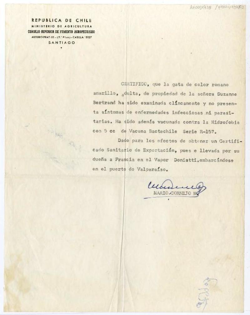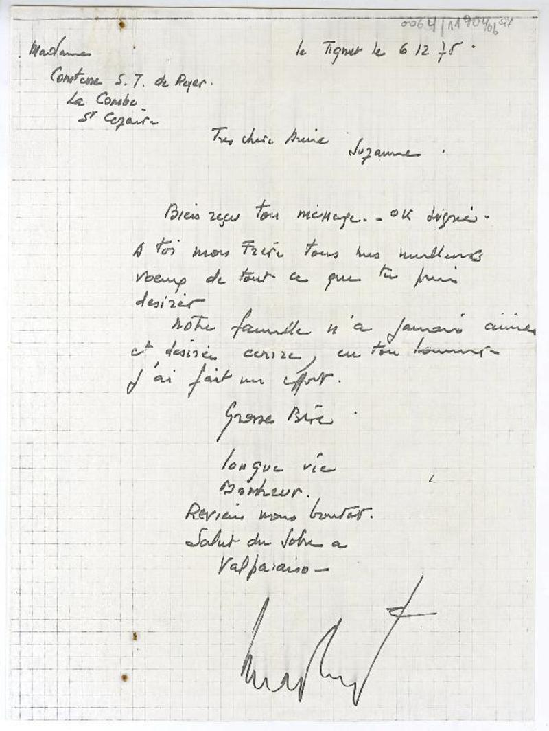 Valparaíso, Chile [a] Suzanne Bertrand Bouillon Certificado, 18 de enero de 1977, [manuscrito] Universidad Católica de Valparaíso.