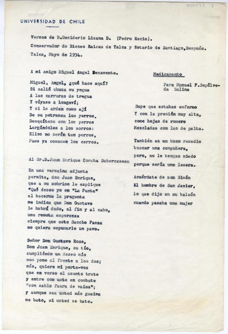 [Versos] [manuscrito] Desiderio Lizana Droguett (Pedro Recio) ; transcripción.