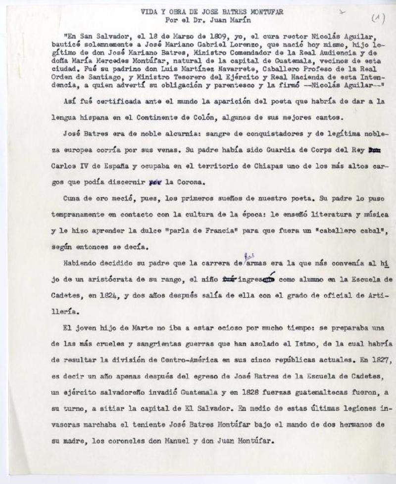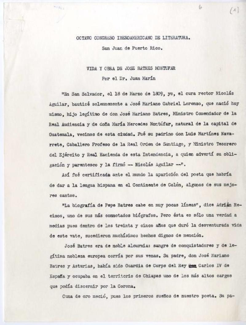 Vida y obra de José Batres Montufar [manuscrito] Juan Marín.