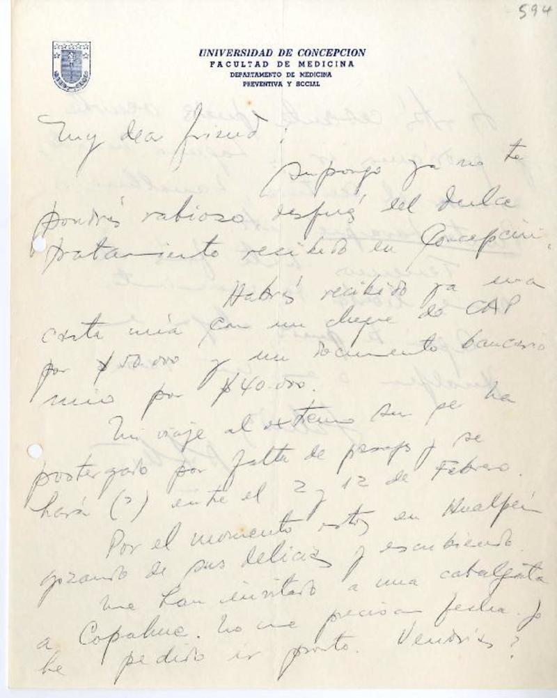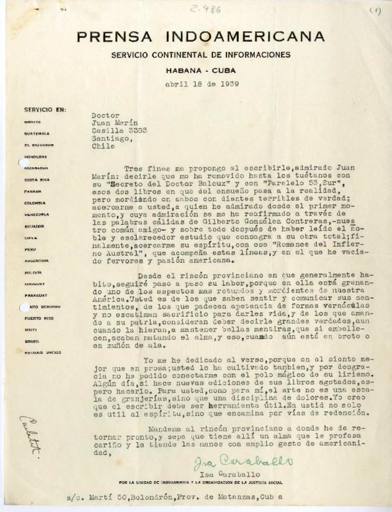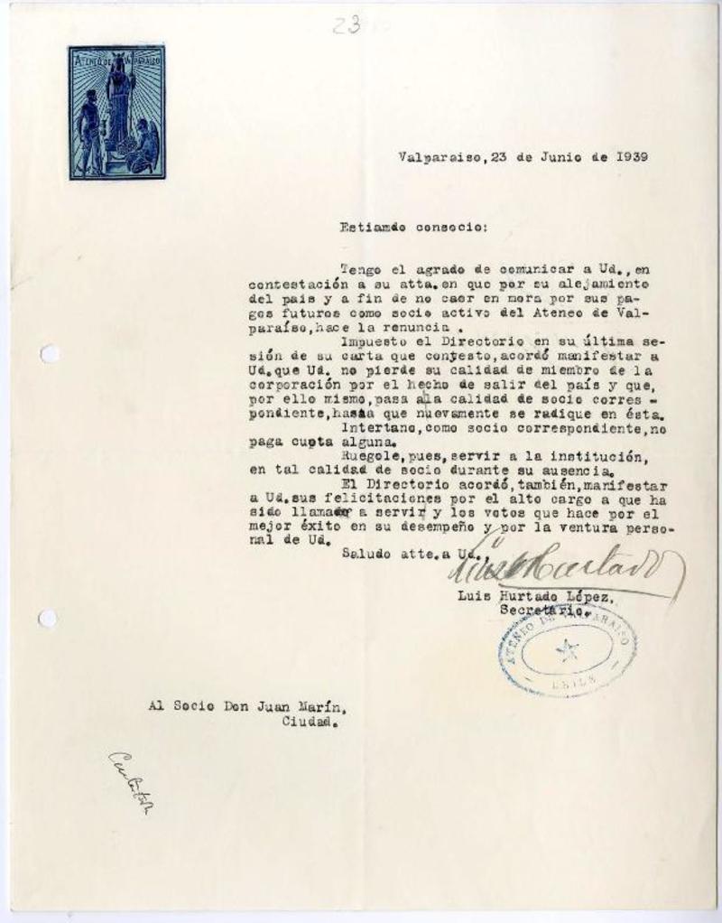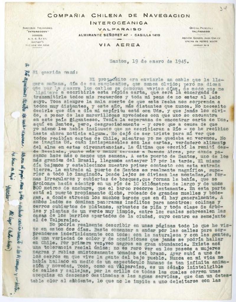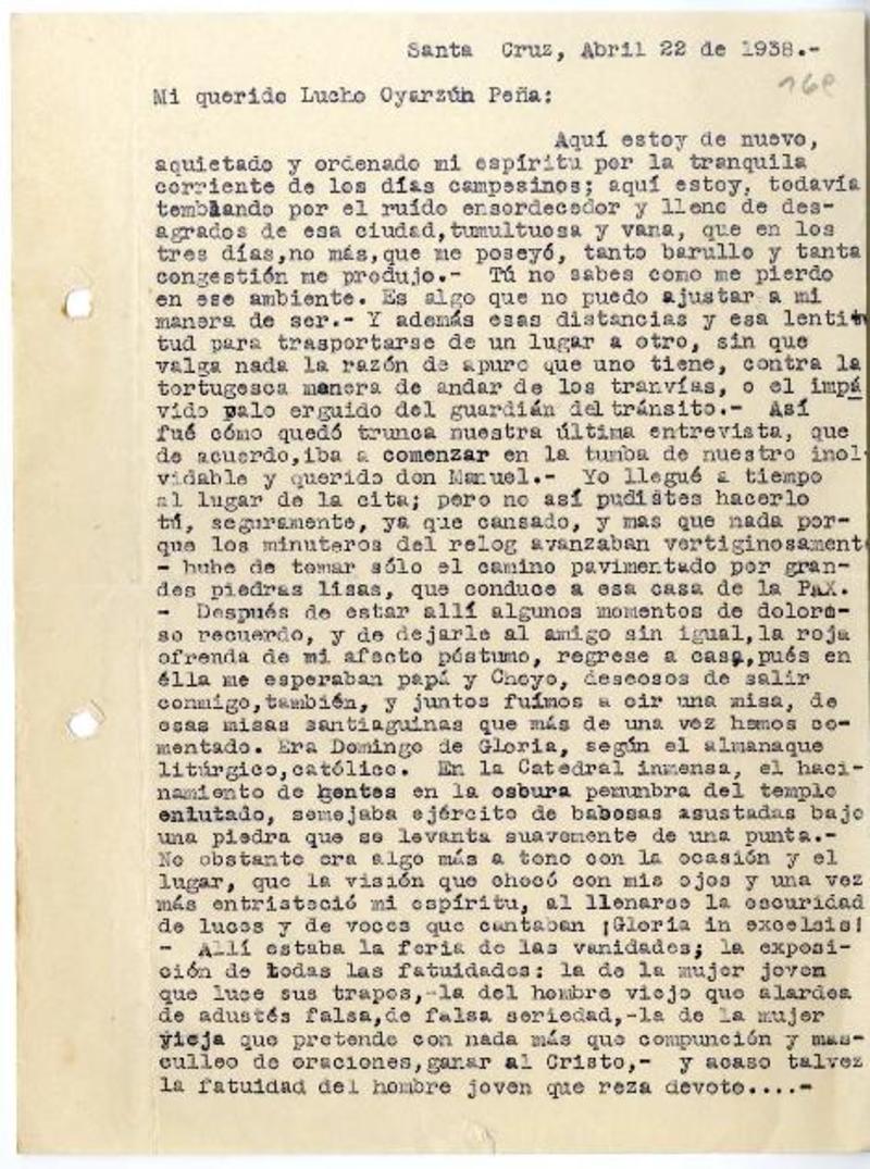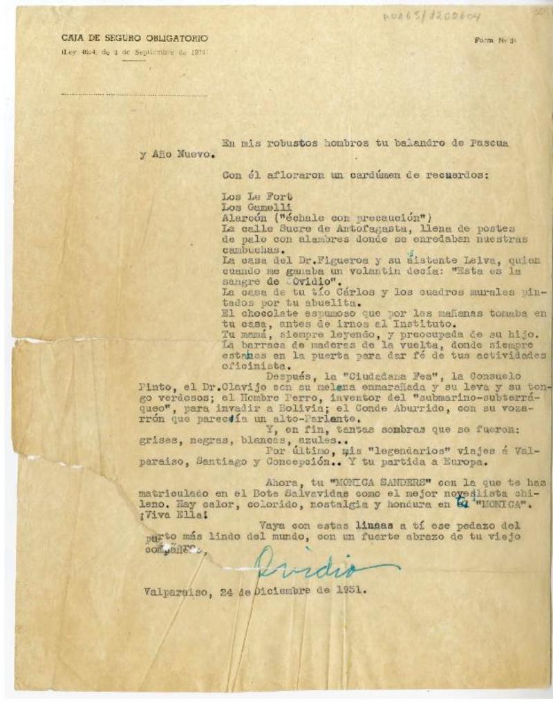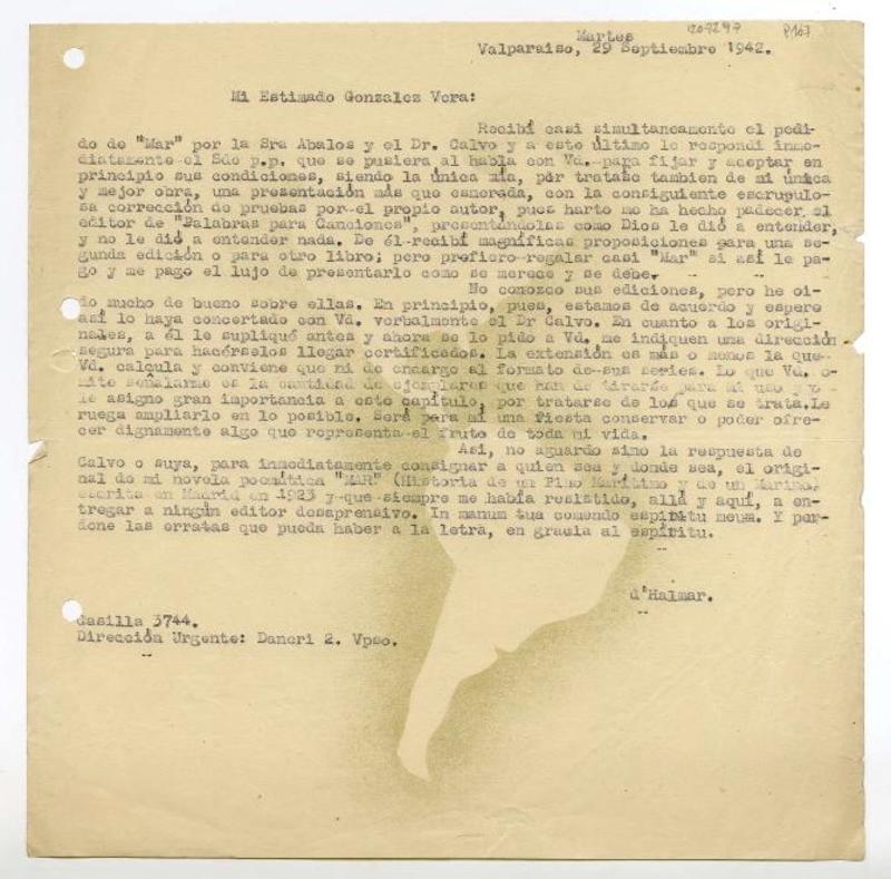 Valparaíso, Chile [a] Oscar castro e Isolda Pradel Carta, 1939, [manuscrito] Augusto D'Halmar.