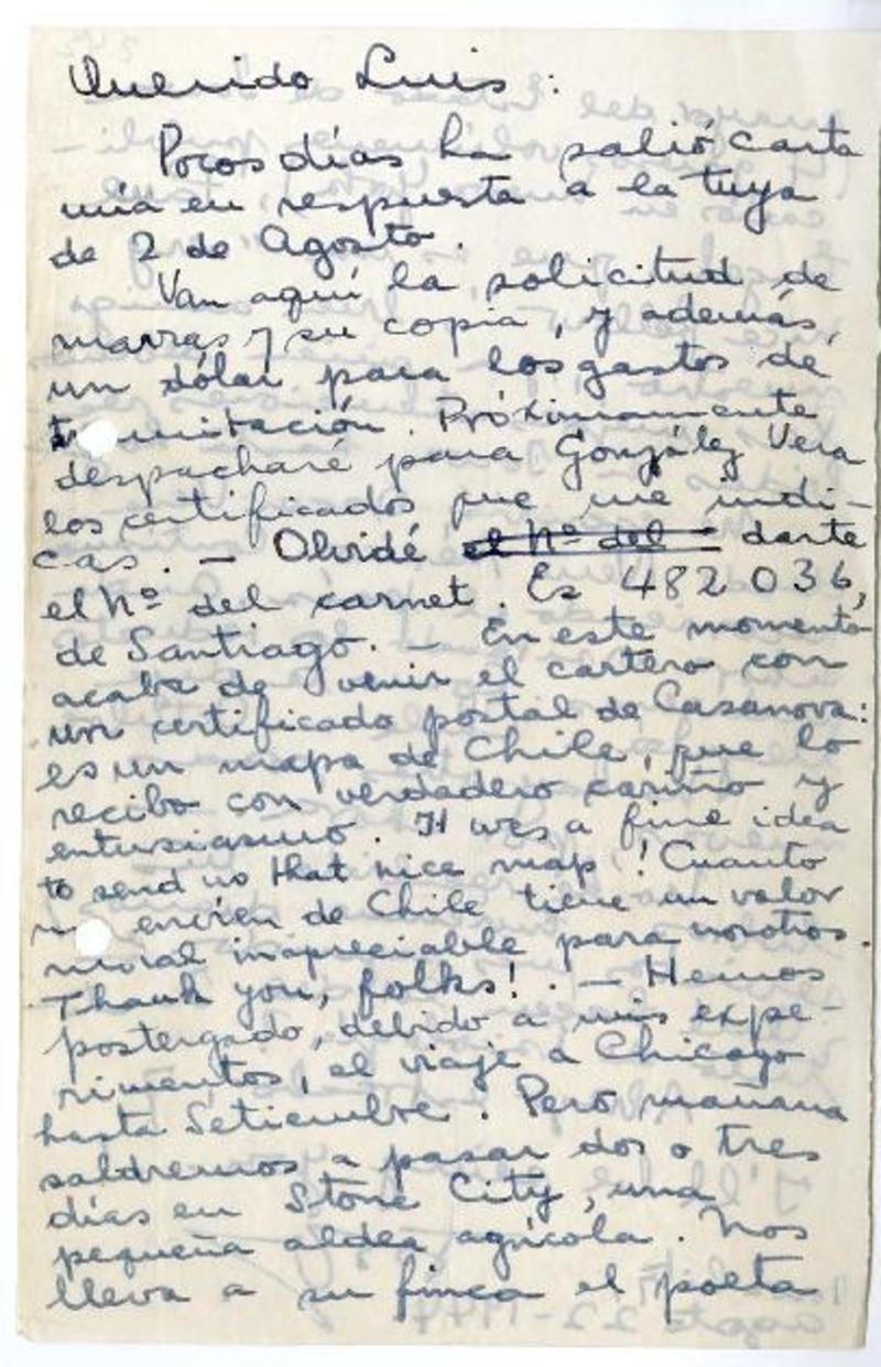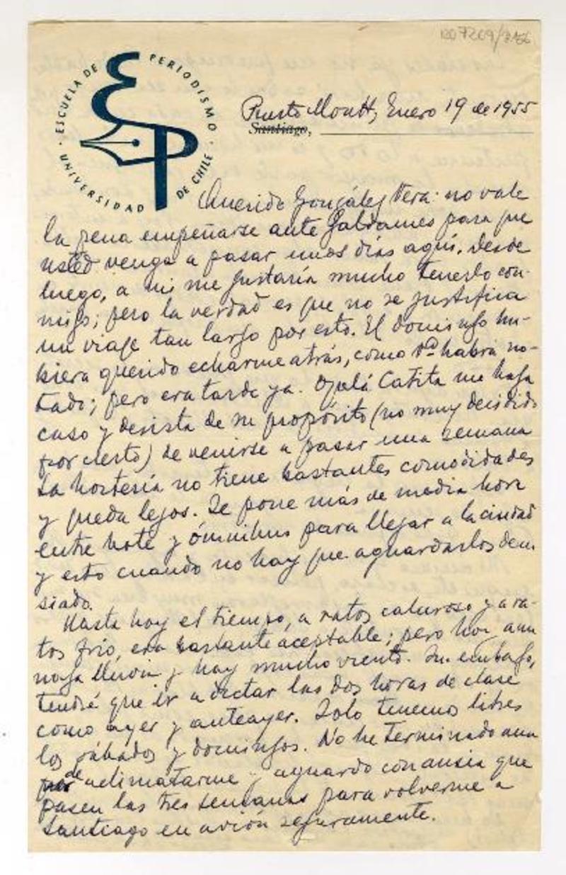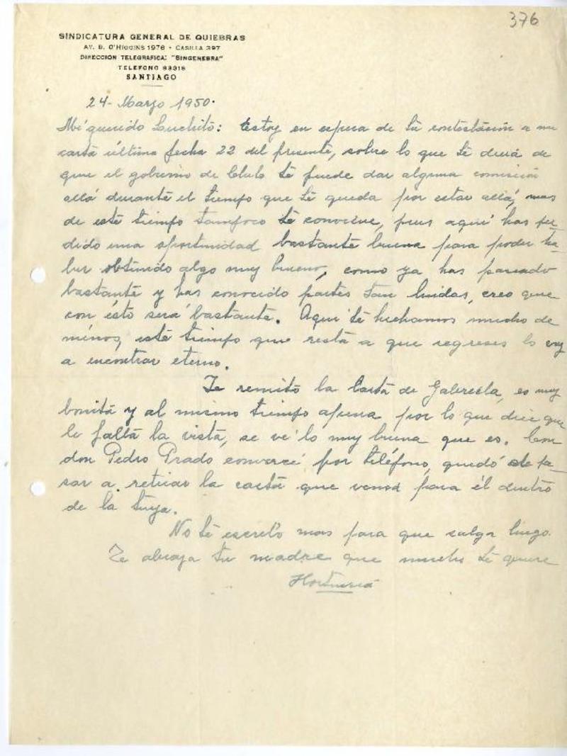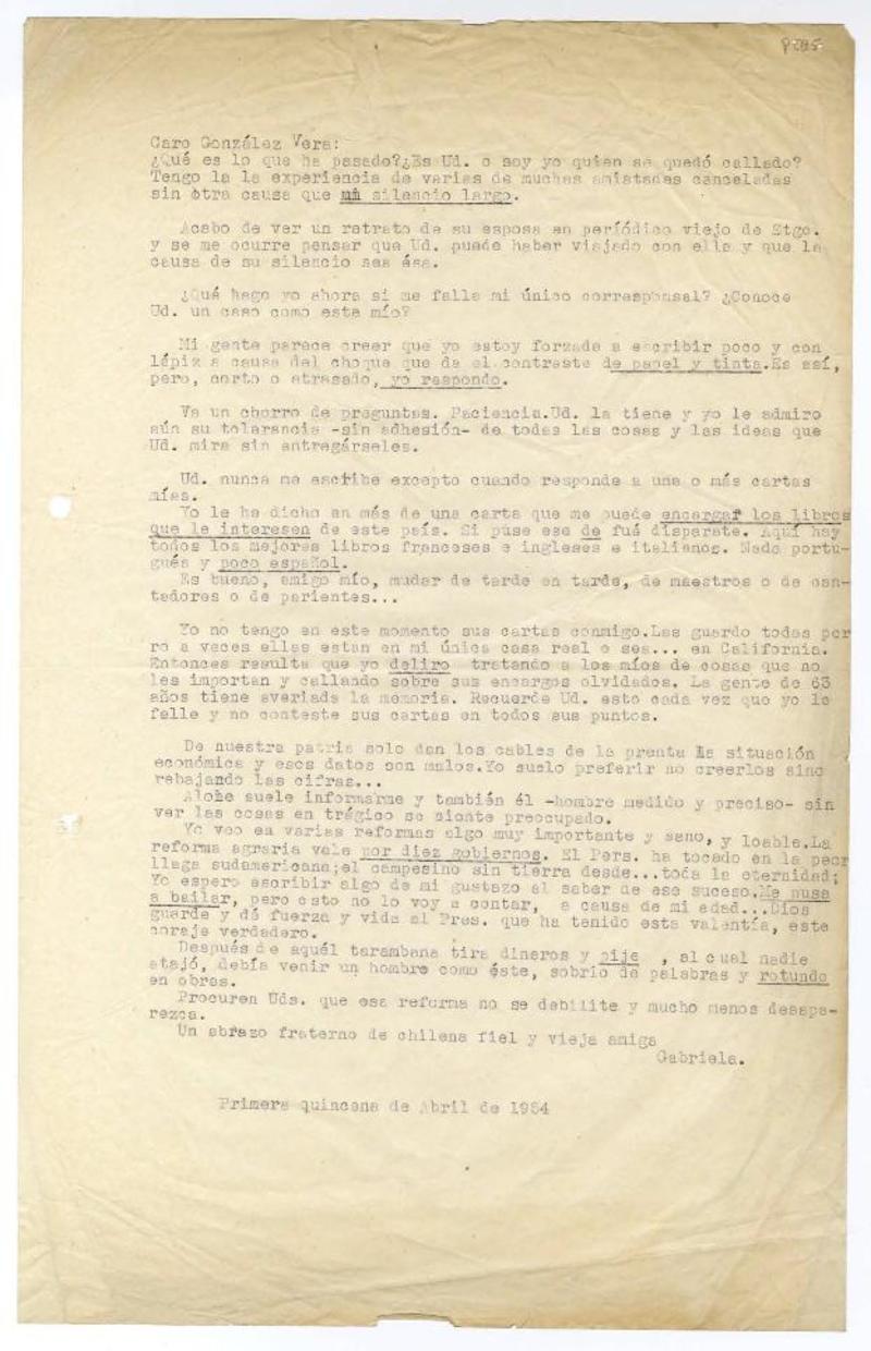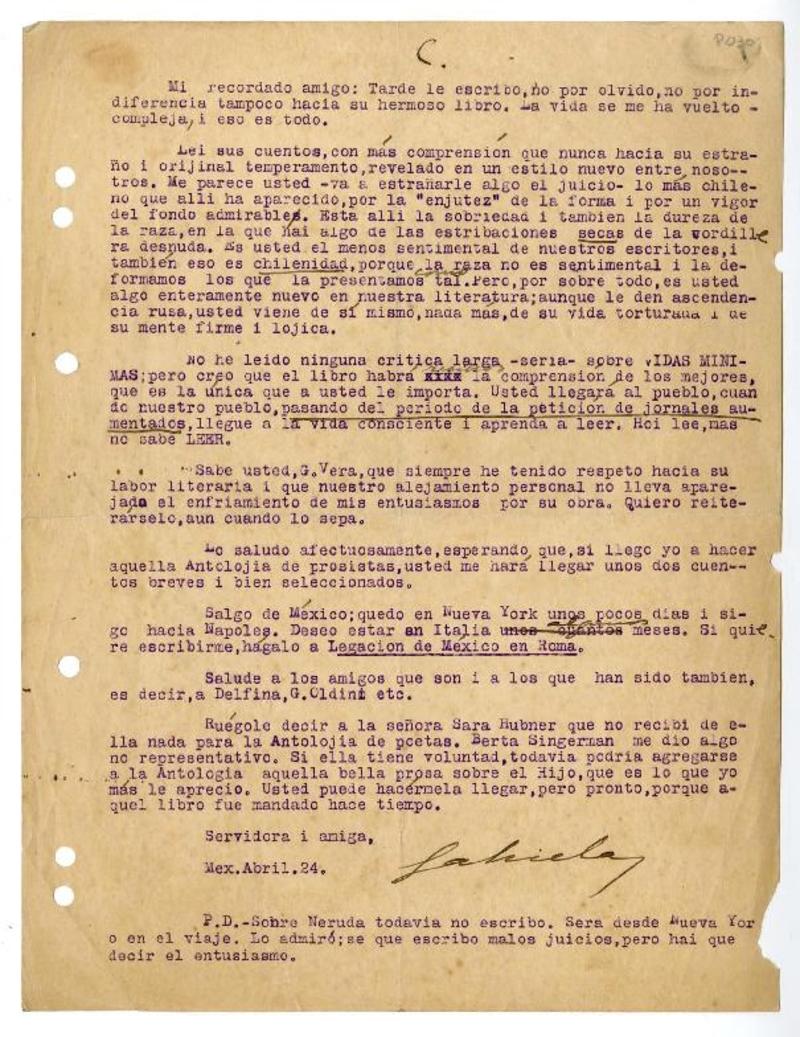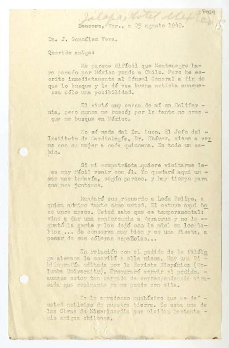 Veracruz, México, [a] José Santos González Vera Carta, 1949 agosto 25, [manuscrito] Gabriela Mistral.