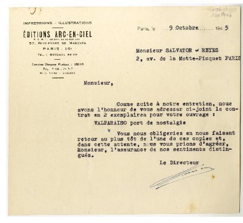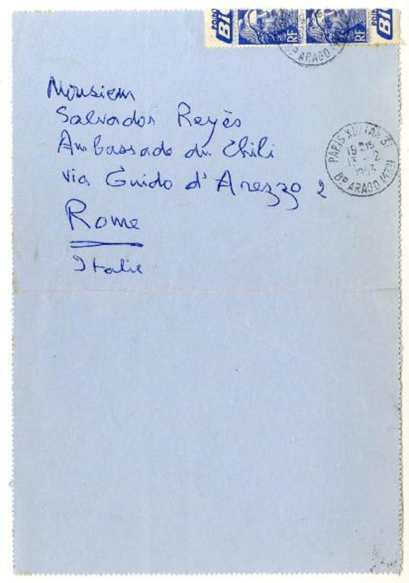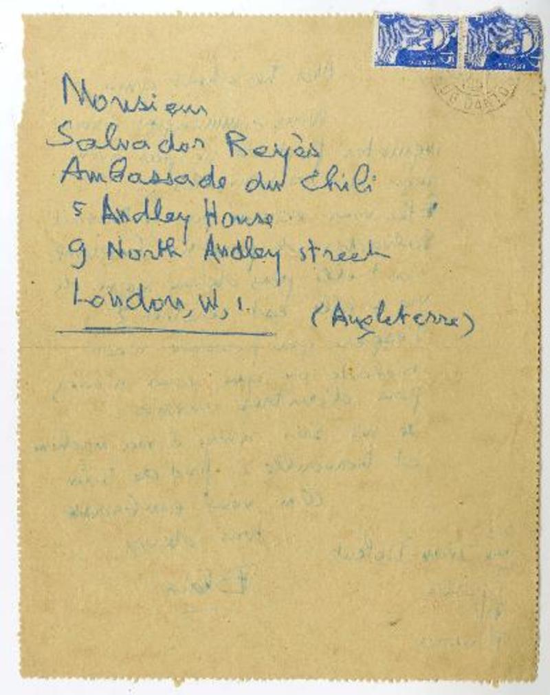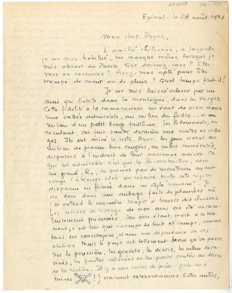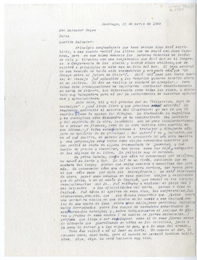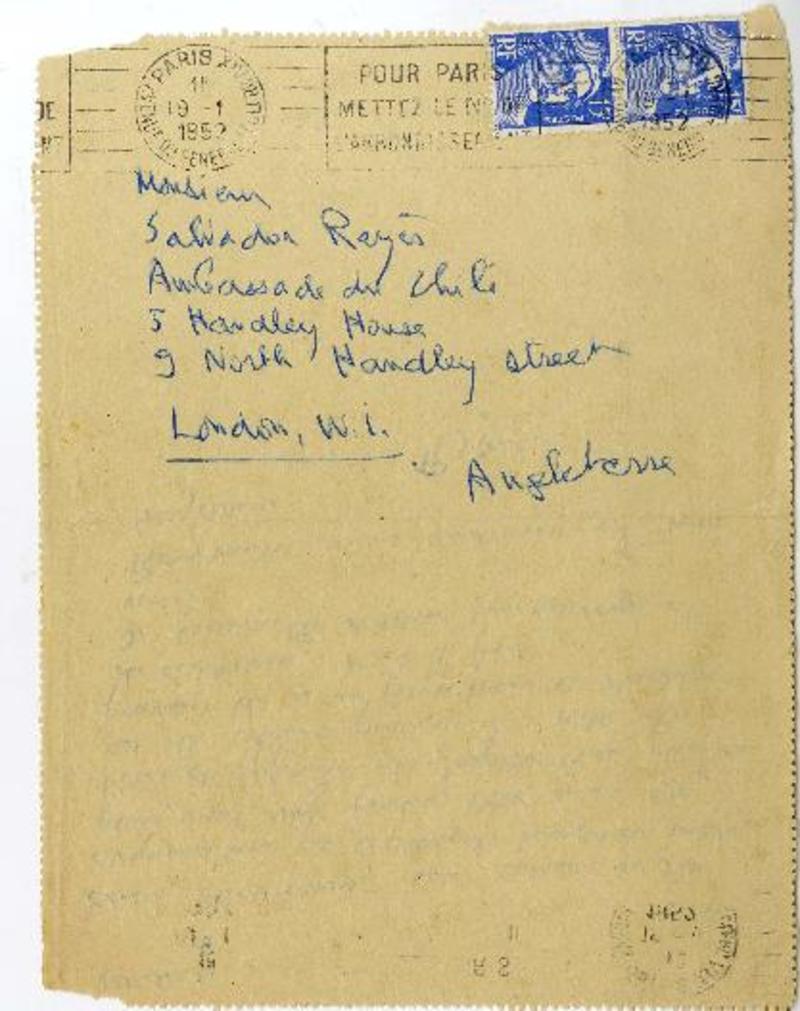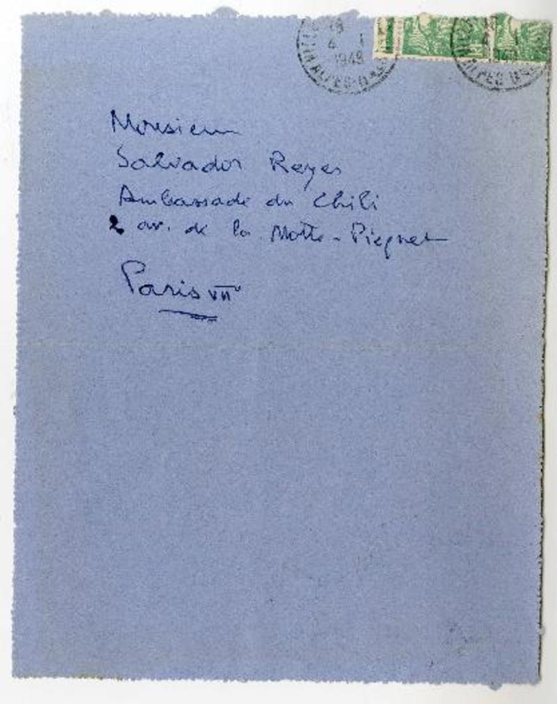 Valparaíso, Chile [a] Salvador Reyes, Paris, Francia Cartas, 10 de junio y 14 de octubre de 1948, [manuscrito] Alfredo Silva Carvallo.