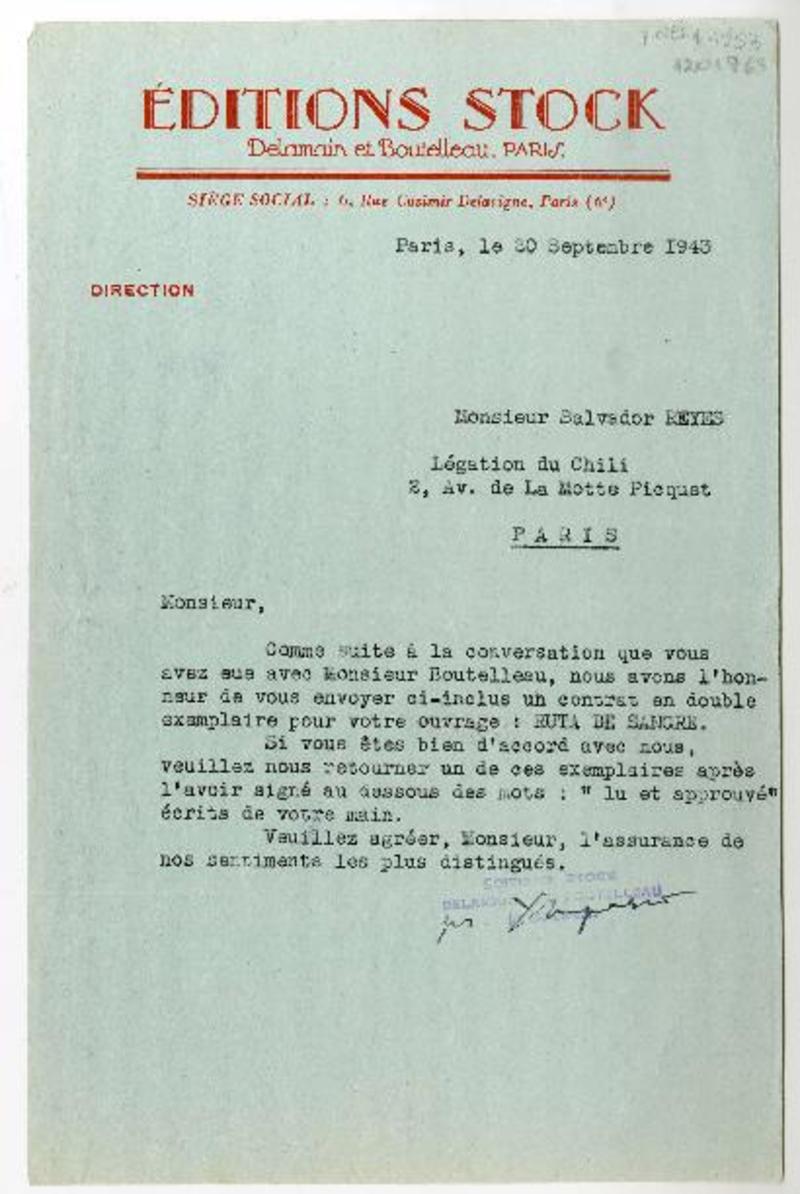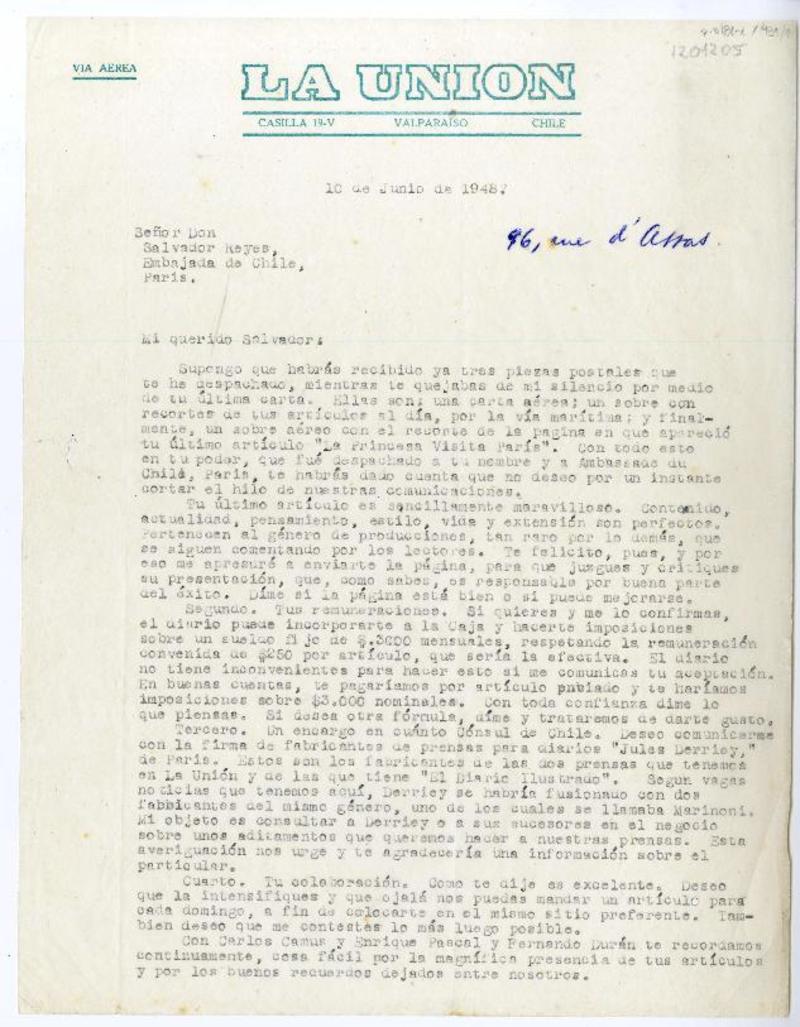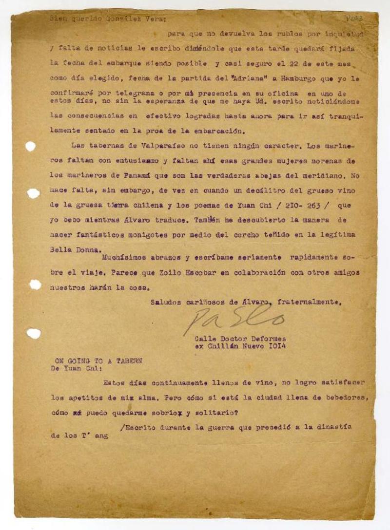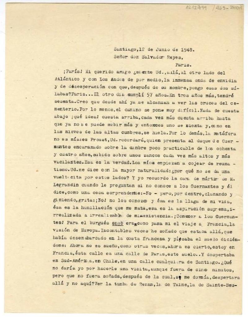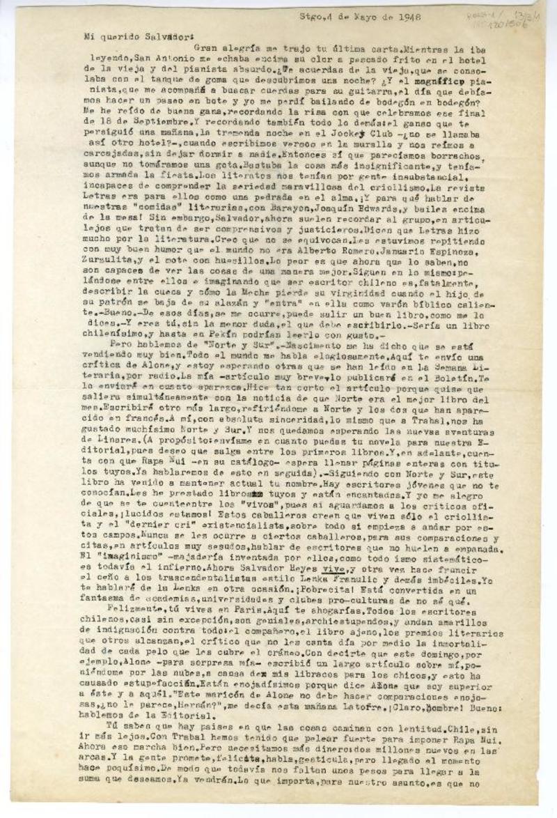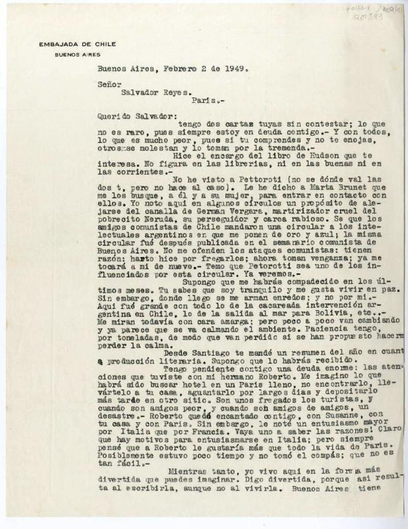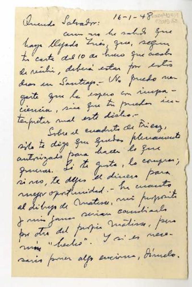 Valparaíso, Chile [a] Salvador Reyes, Paris, Francia Cartas, 10 de junio y 14 de octubre de 1948, [manuscrito] Alfredo Silva Carvallo.