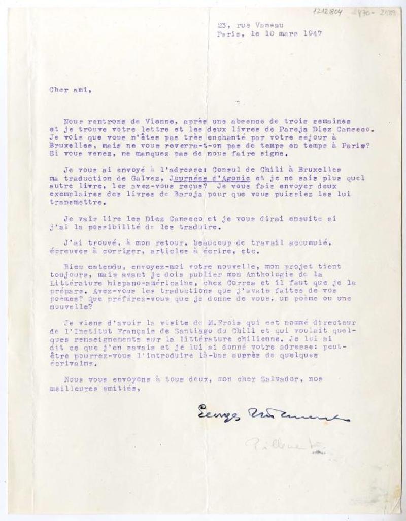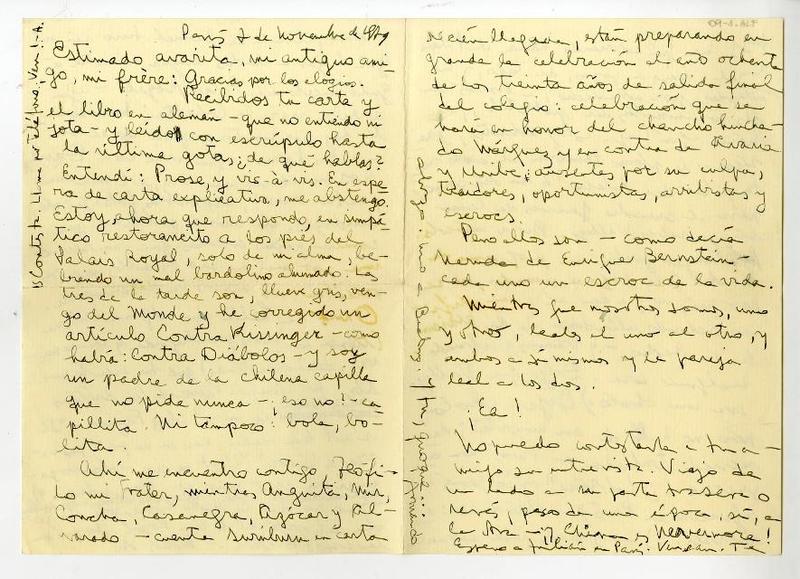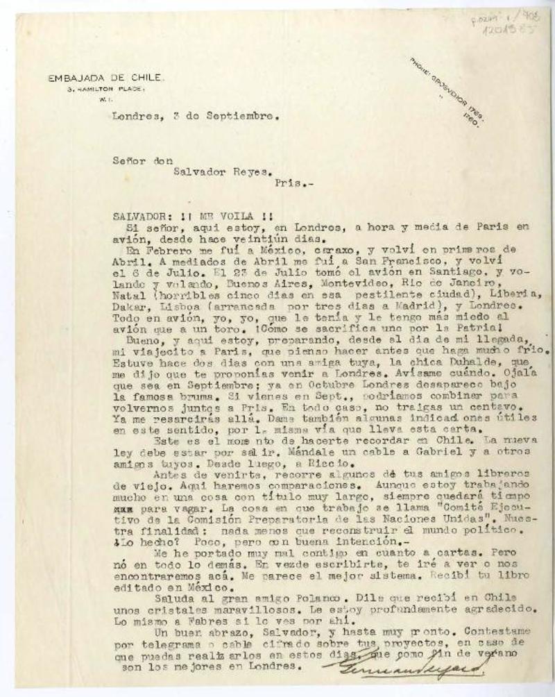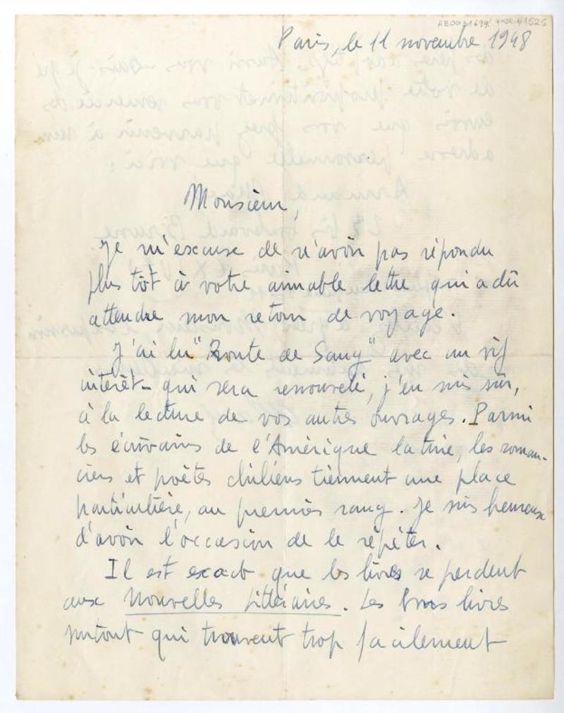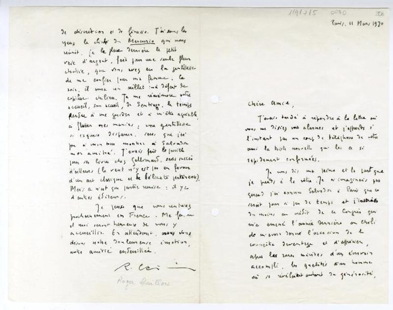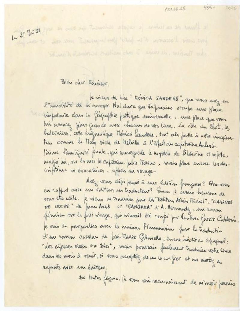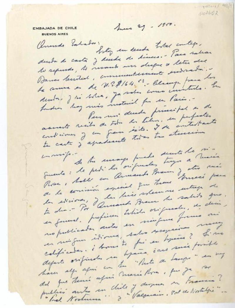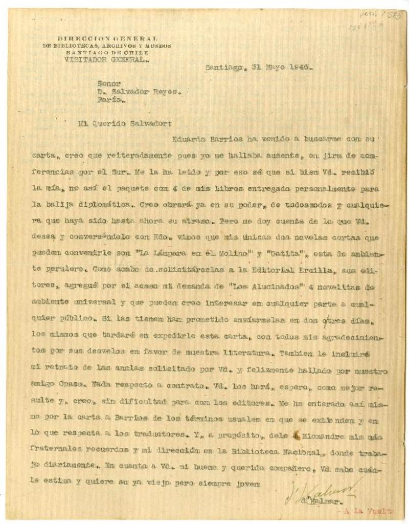 Valparaíso, Chile [a] Salvador Reyes, Paris, Francia Cartas, 10 de junio y 14 de octubre de 1948, [manuscrito] Alfredo Silva Carvallo.