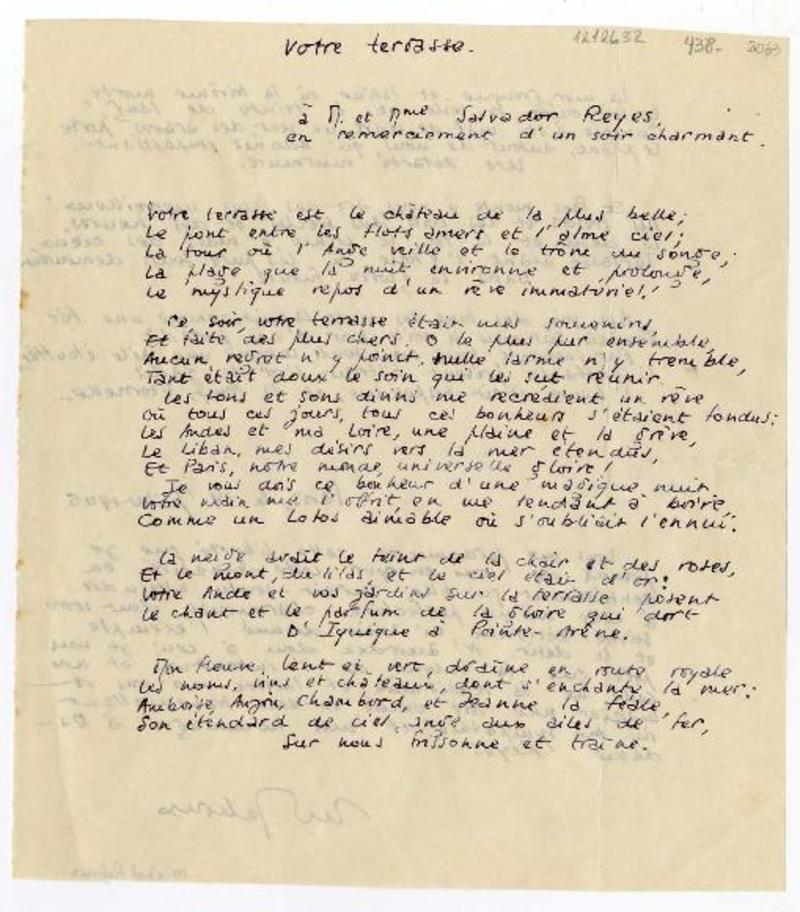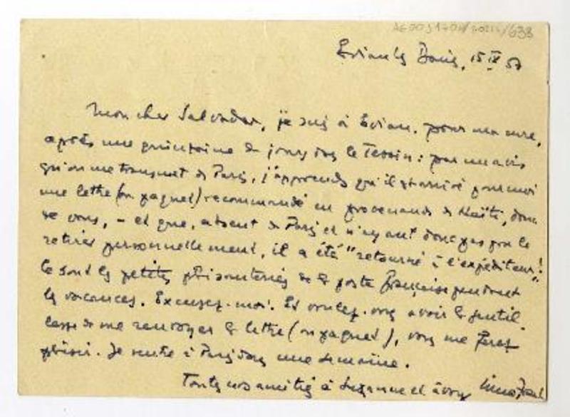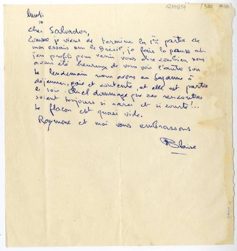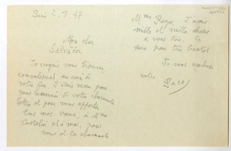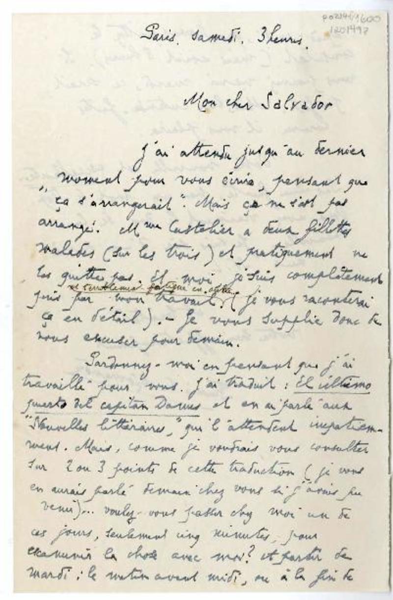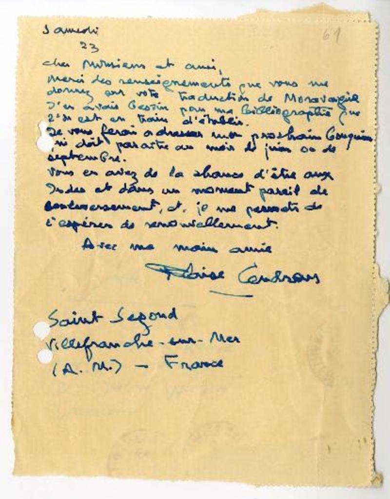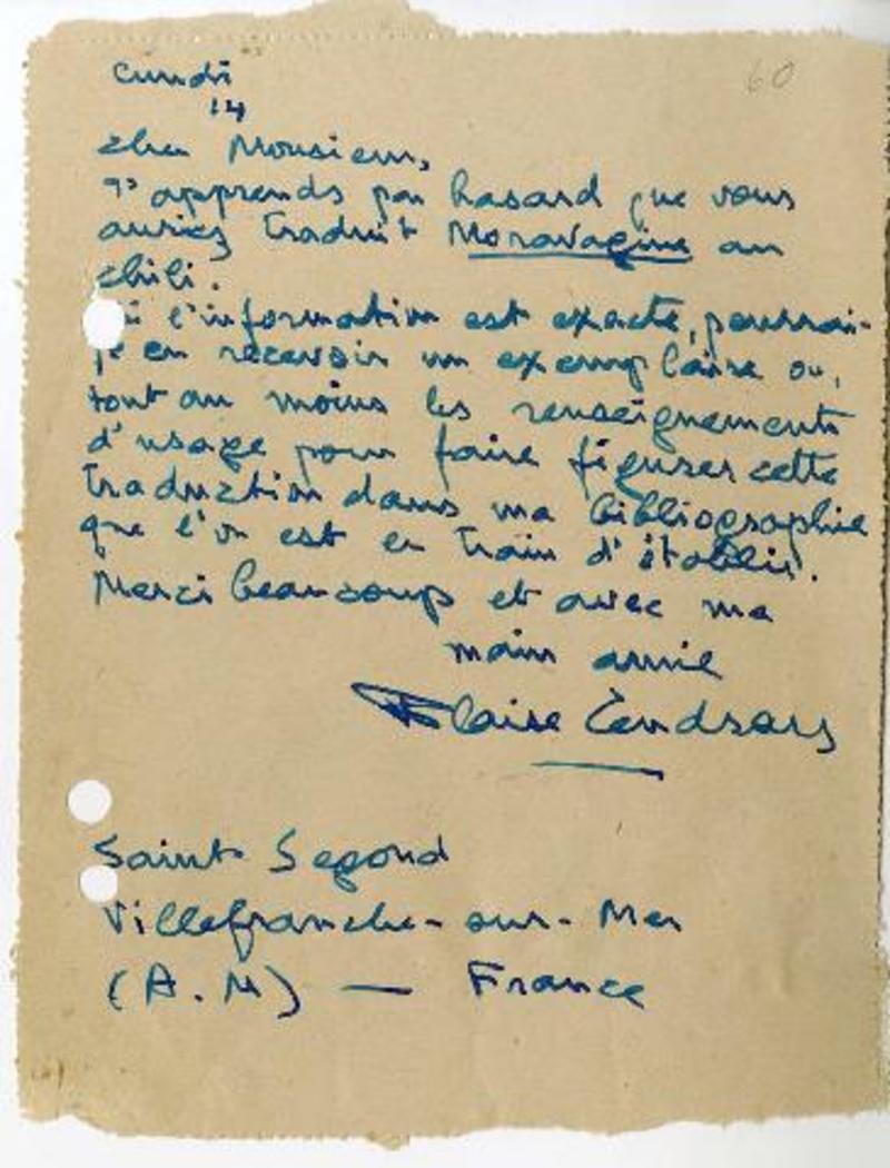 Villefranche-sur-Mer, Francia [a] Salvador Reyes Cartas, enero, marzo y mayo de 1949, [manuscrito] Blaise Cendrars.