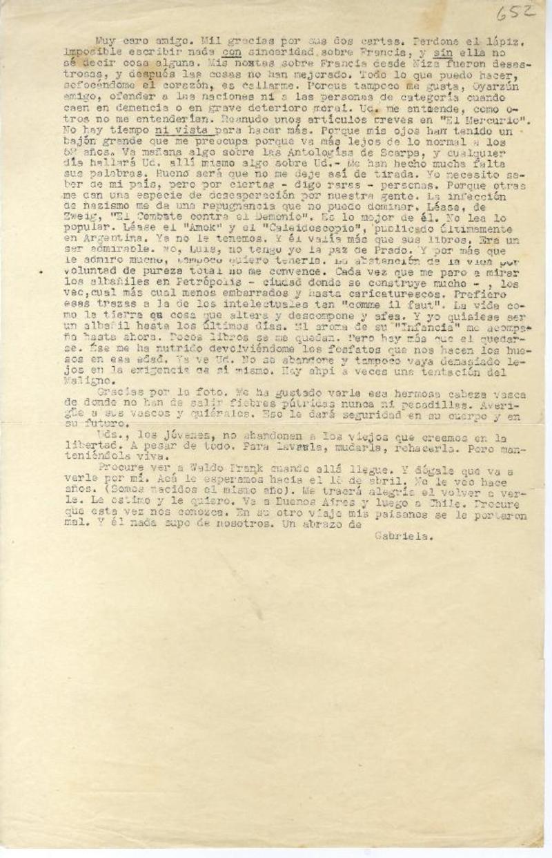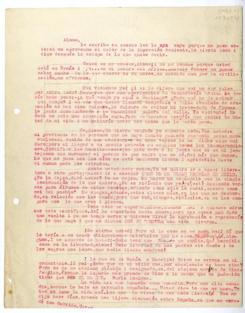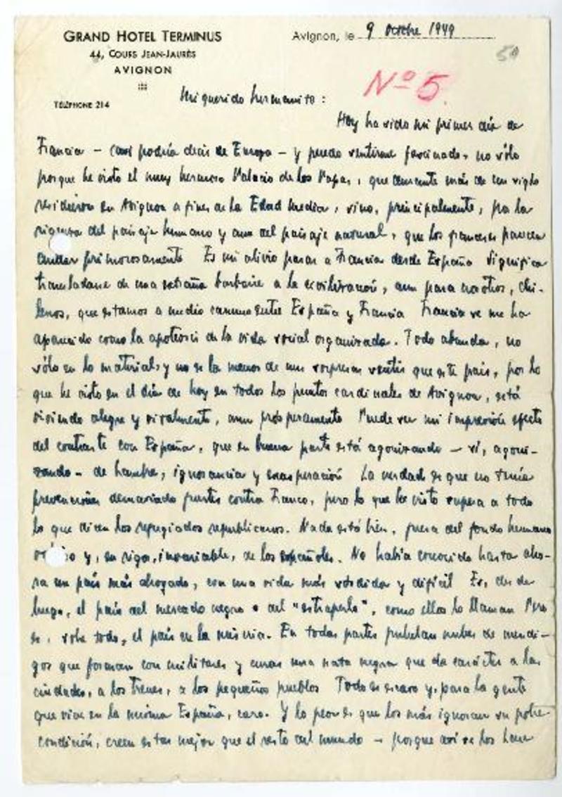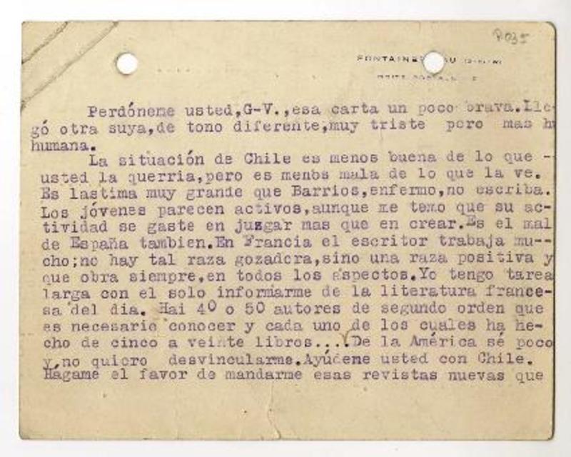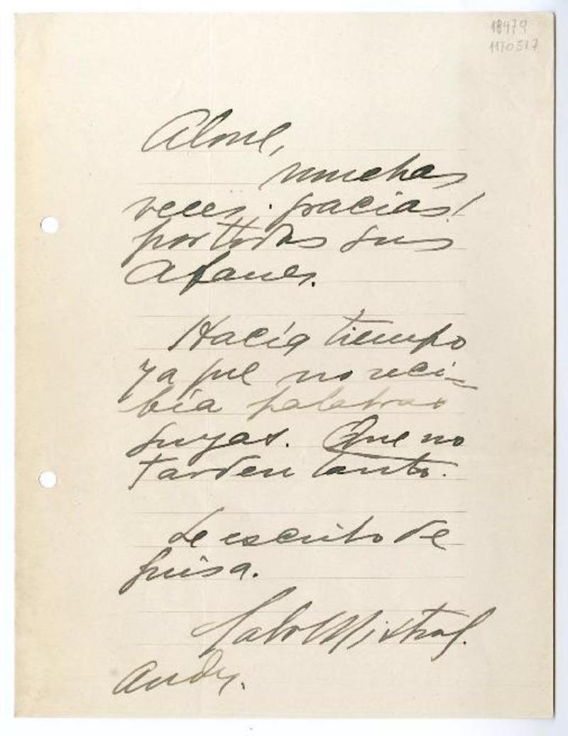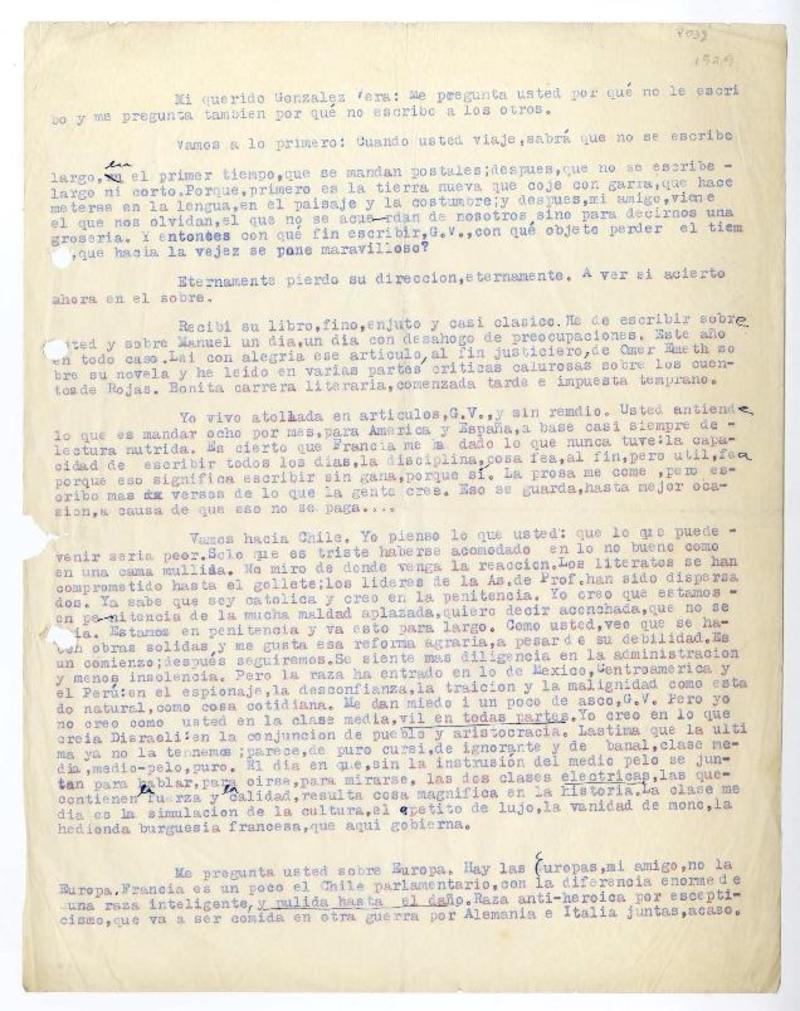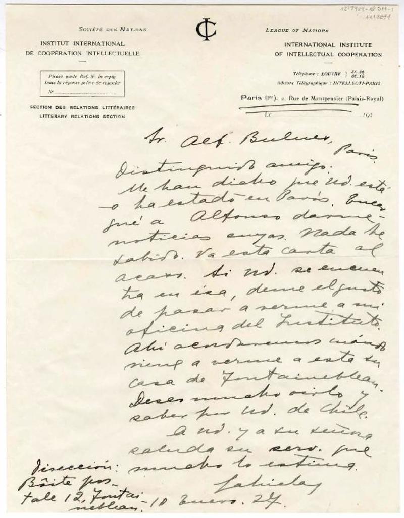 Vaucluse, Francia [a] Alfonso Bulnes, Chile Carta, 1929 agosto 27, [manuscrito] Gabriela Mistral.