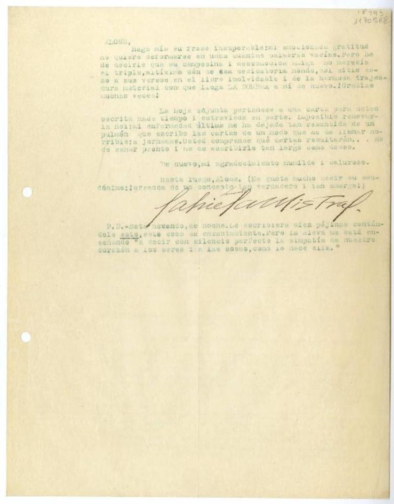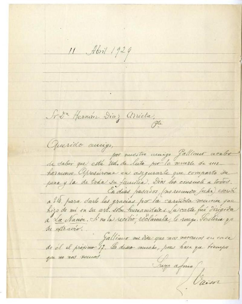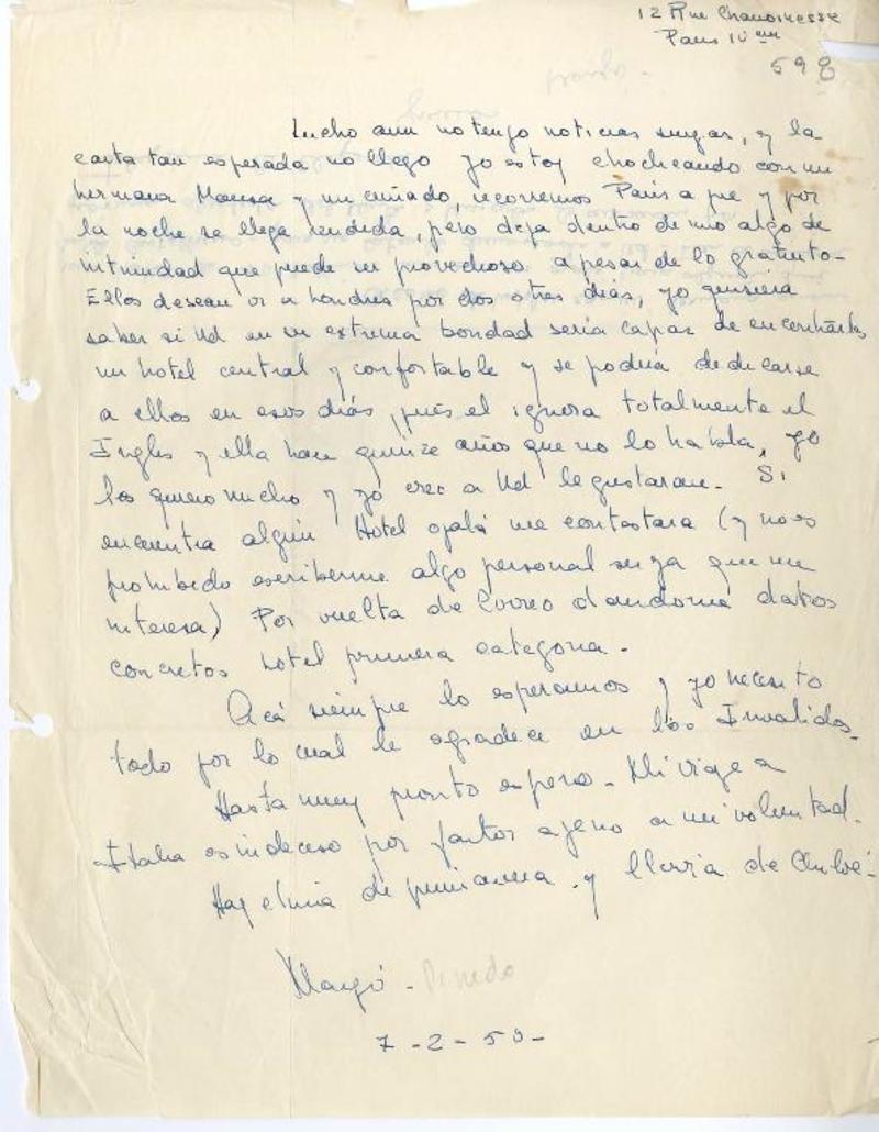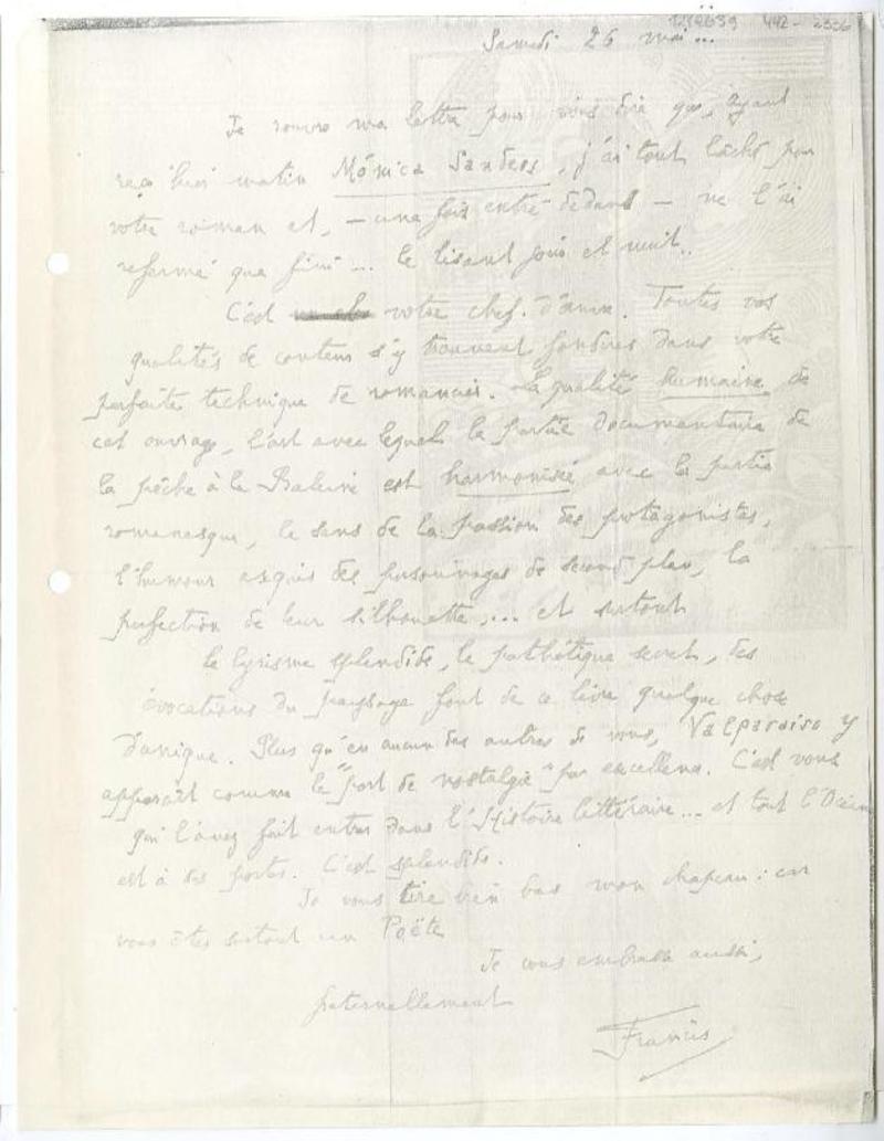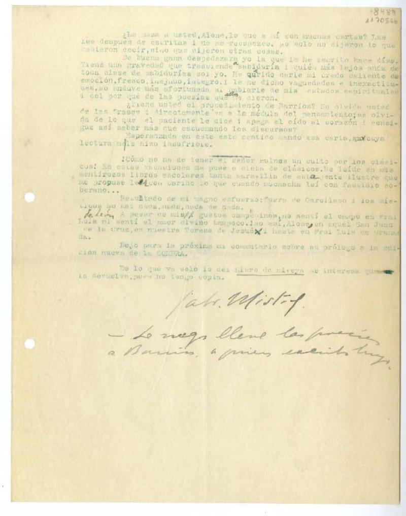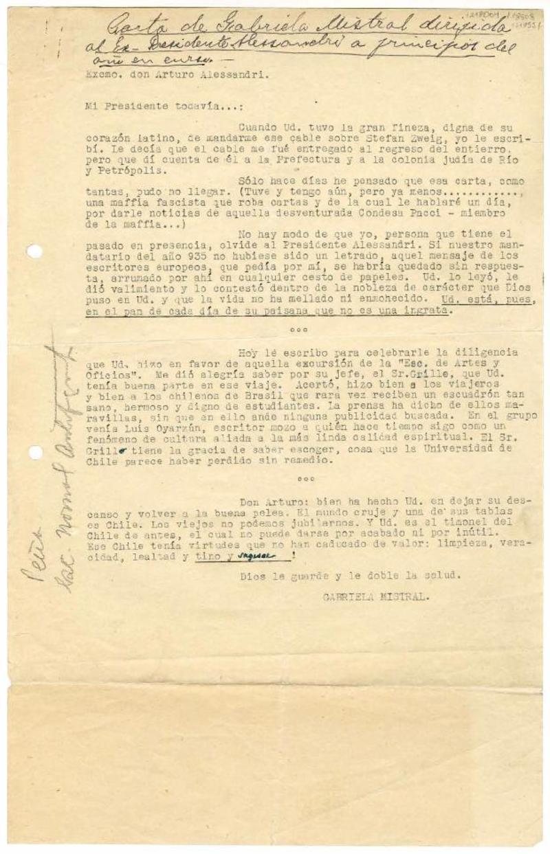 Vaucluse, Francia [a] Alfonso Bulnes, Chile Carta, 1929 agosto 27, [manuscrito] Gabriela Mistral.