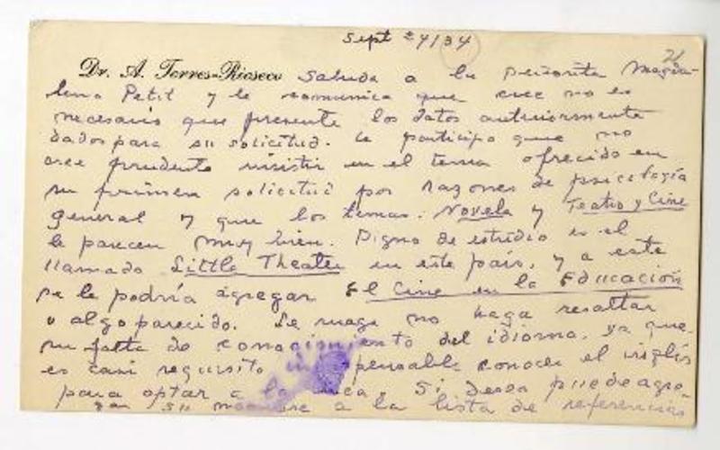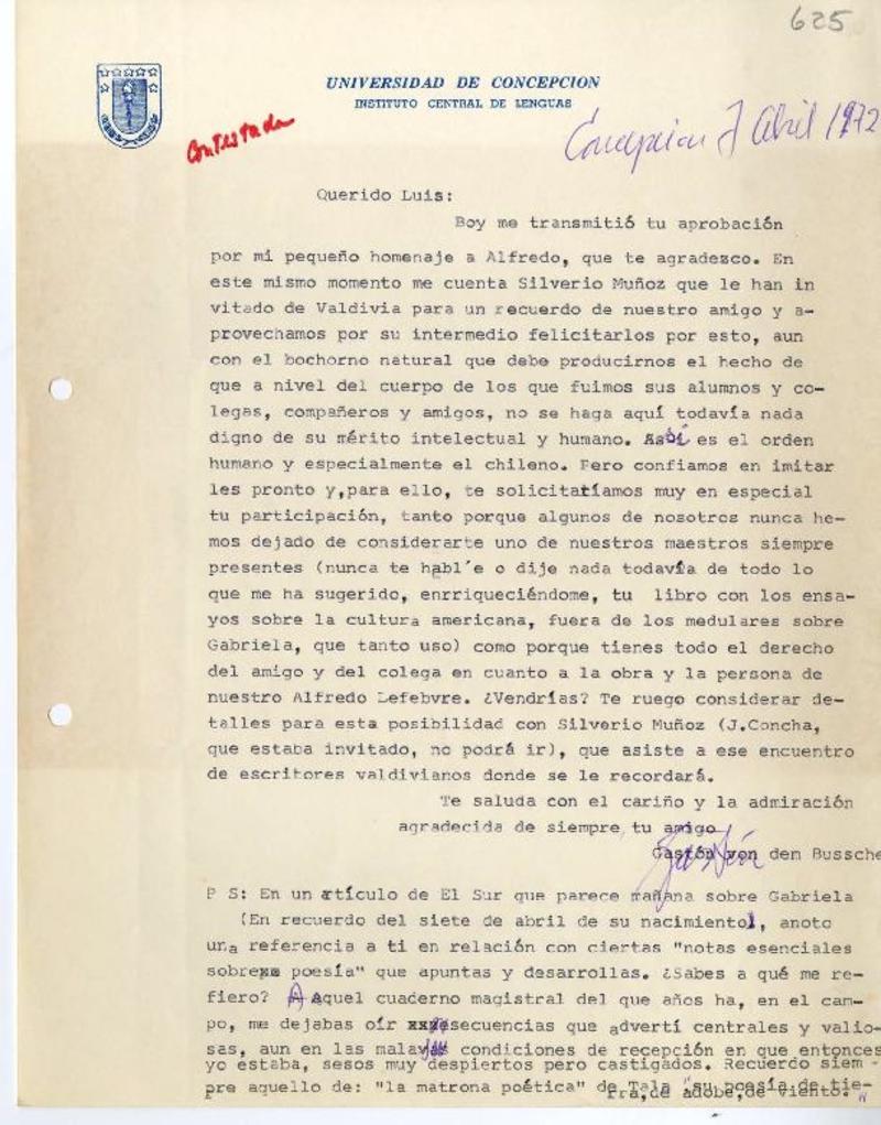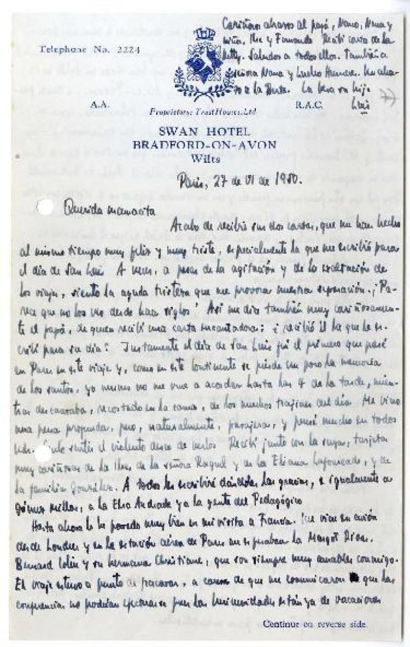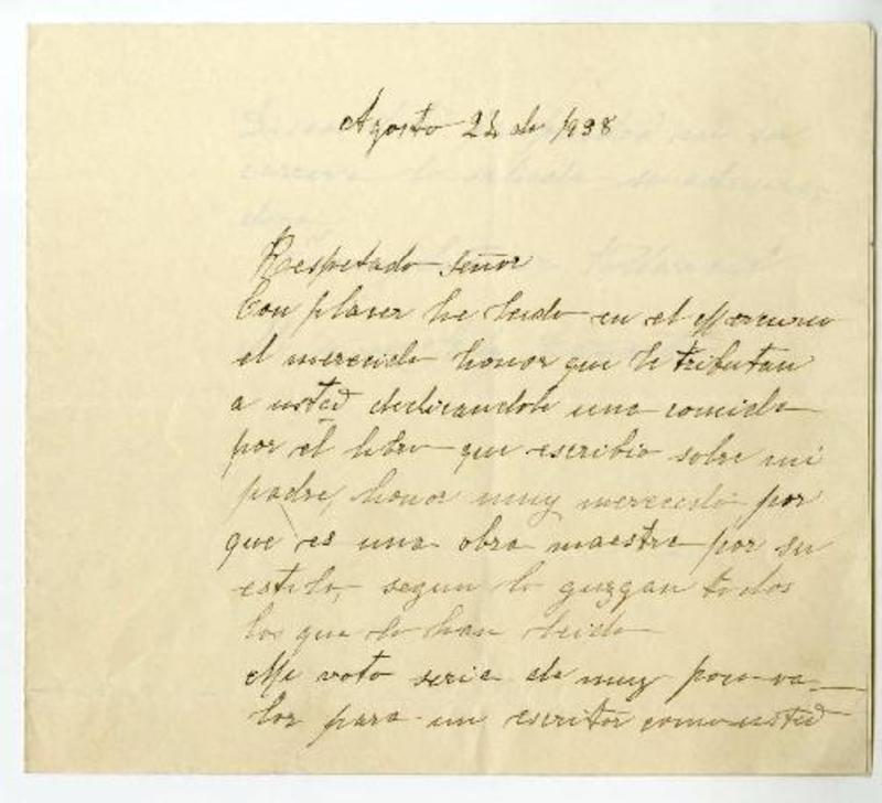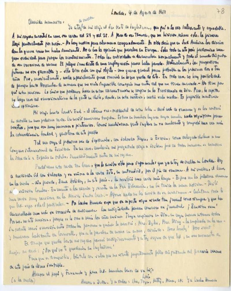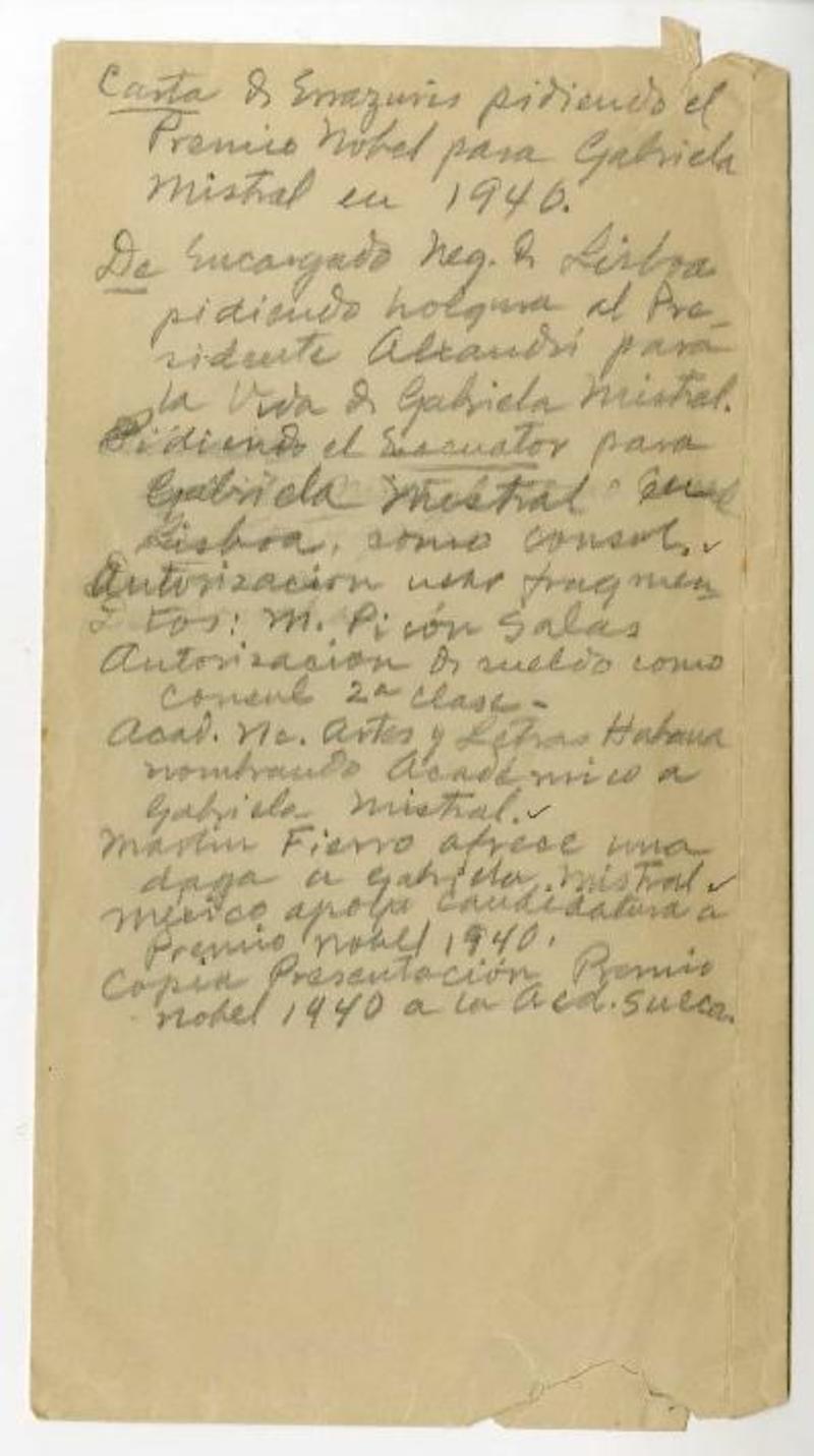 Vaucluse, Francia [a] Alfonso Bulnes, Chile Carta, 1929 agosto 27, [manuscrito] Gabriela Mistral.