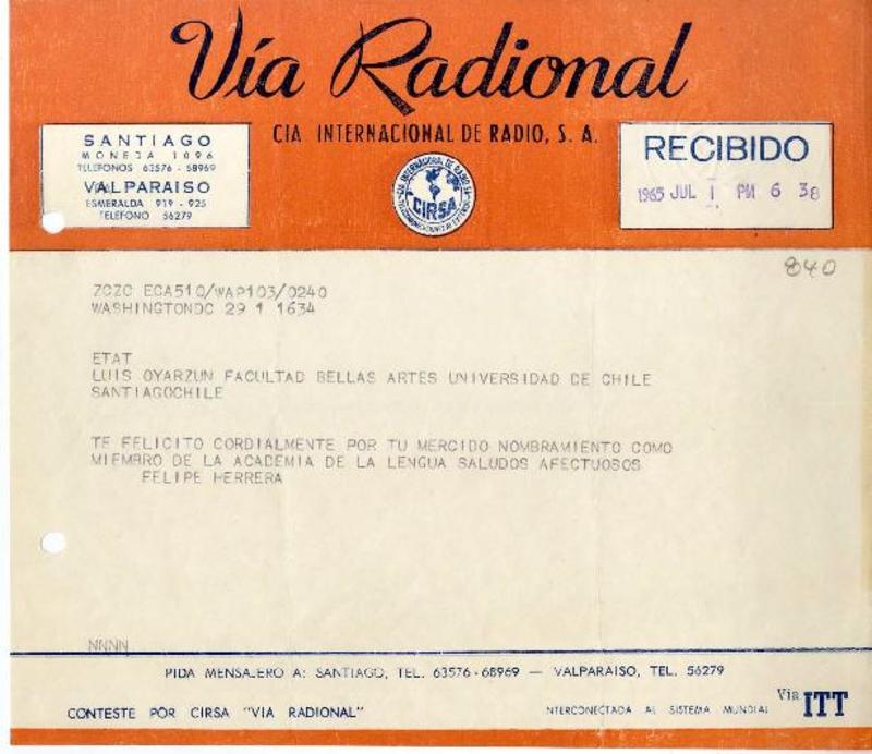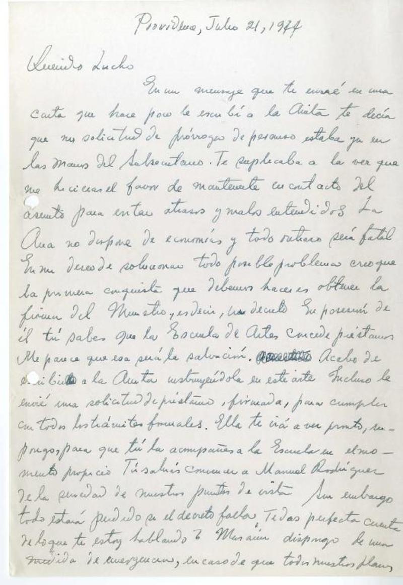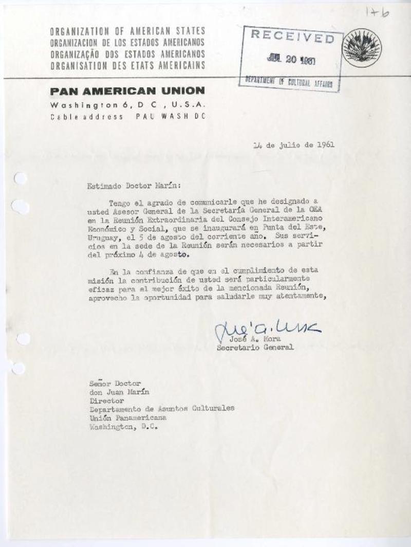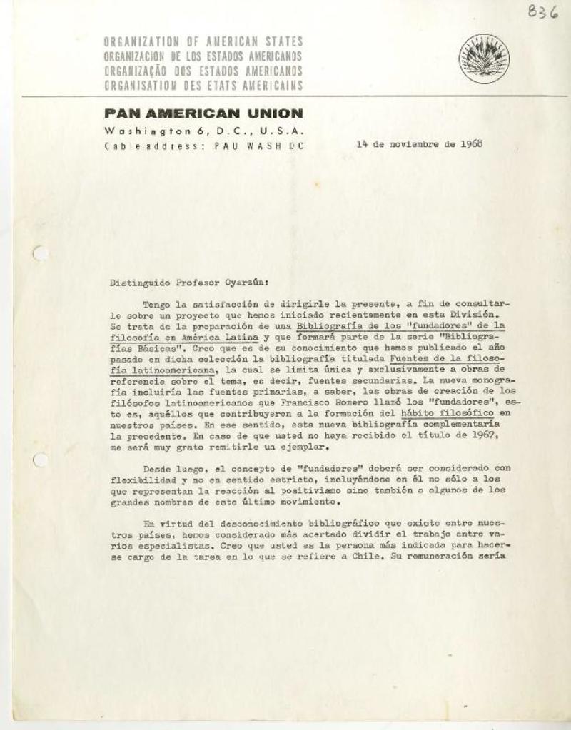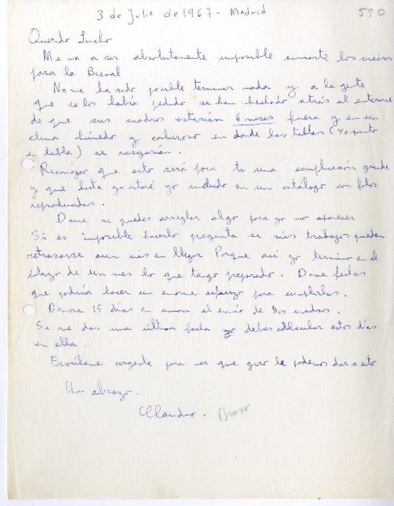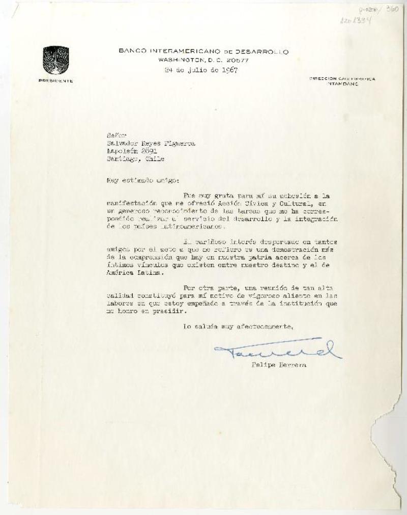 Washington D.C. [a] Salvador Reyes, Santiago, Chile Carta, 1967 julio 24, [manuscrito] Felipe Herrera.