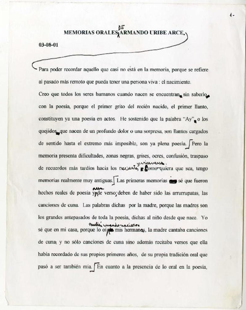 Antes de la noche [manuscrito] Armando Uribe Arce.