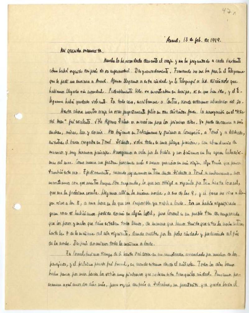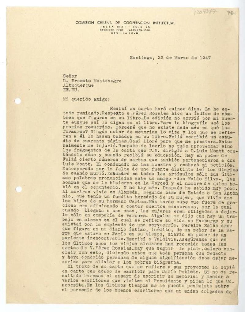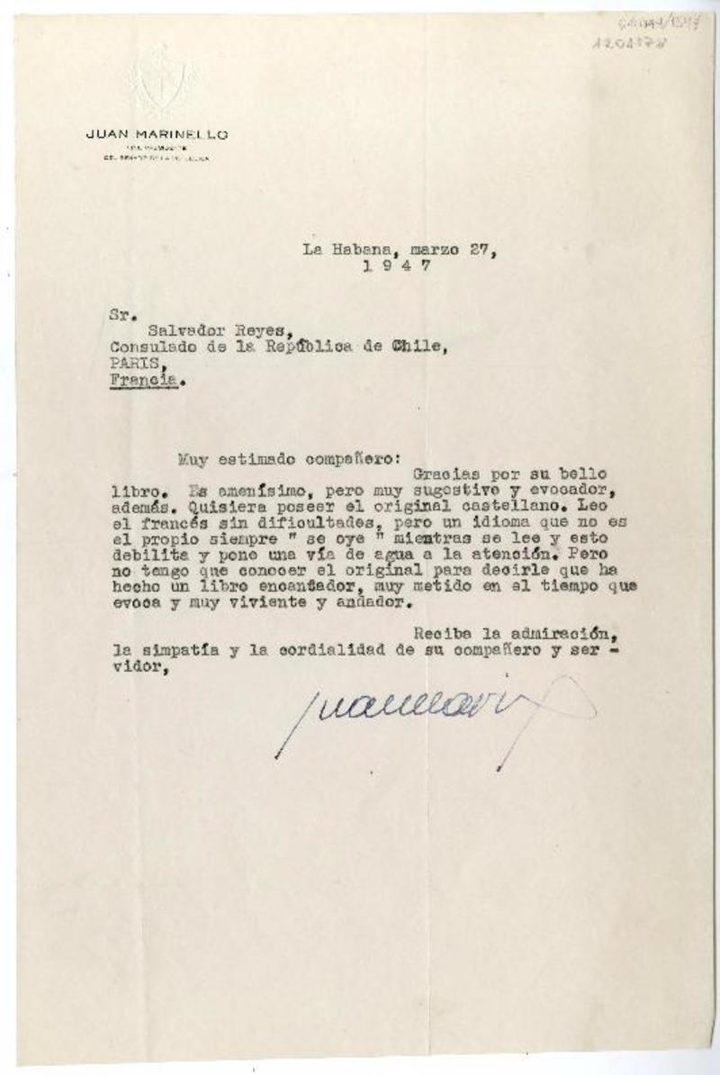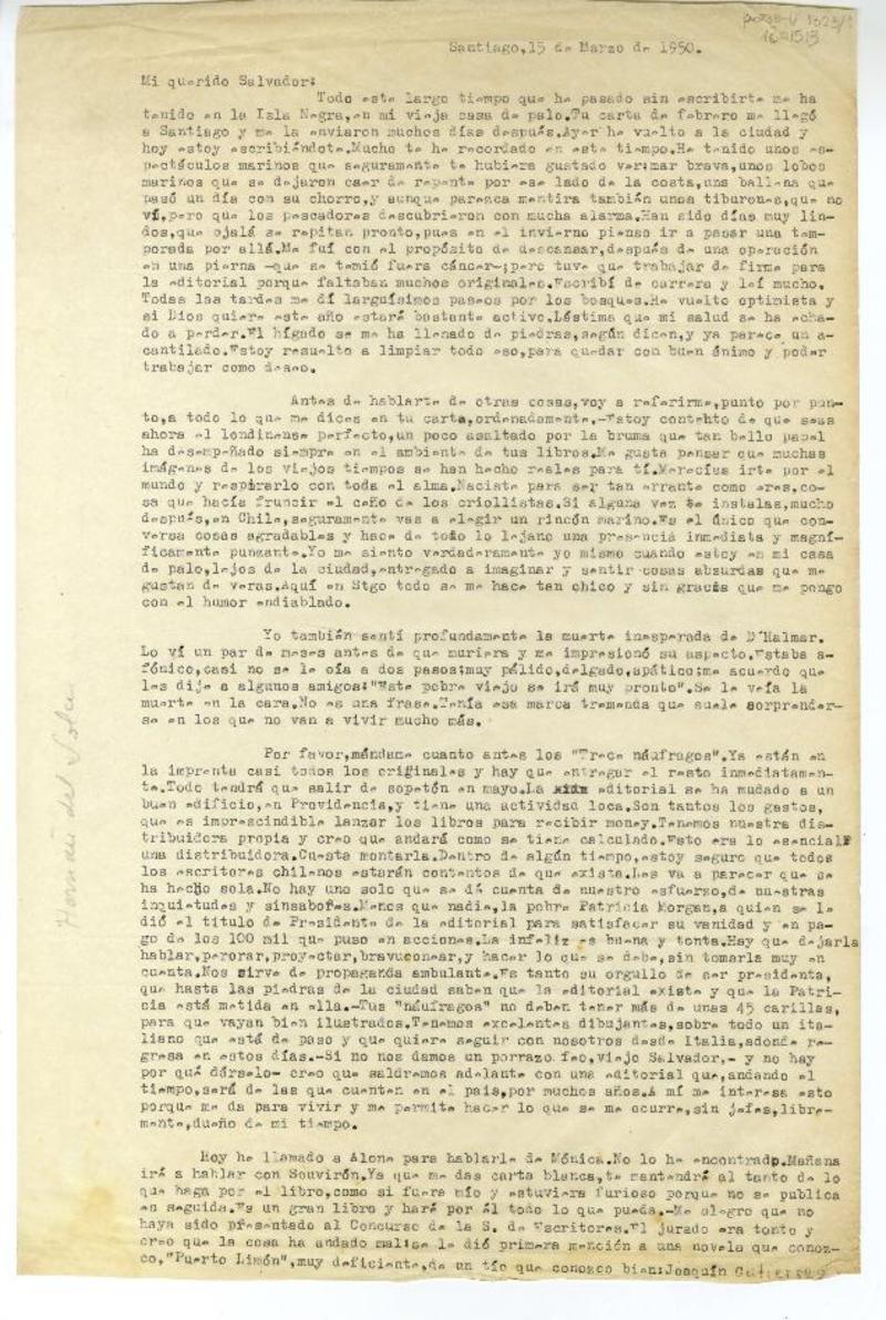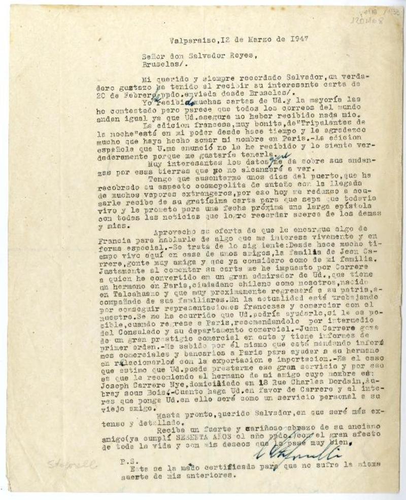 Valparaíso, Chile [a] Salvador Reyes, Bruselas Carta, 1947 marzo 12, [manuscrito] Staforelli.