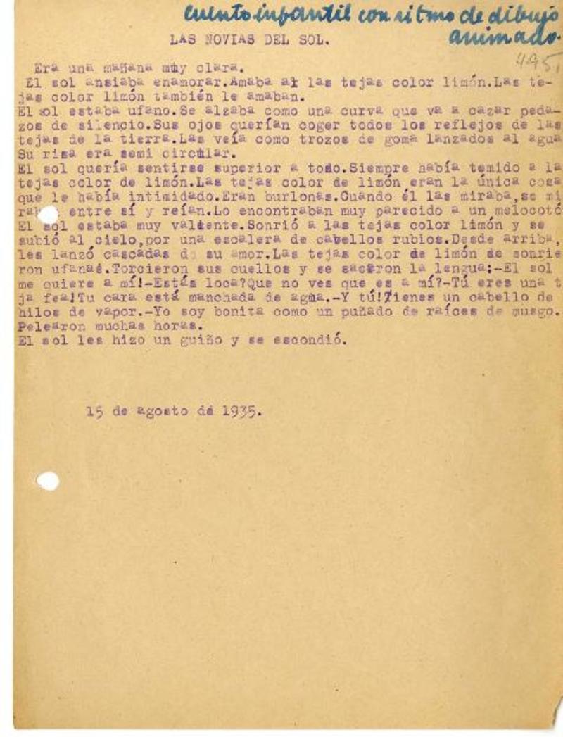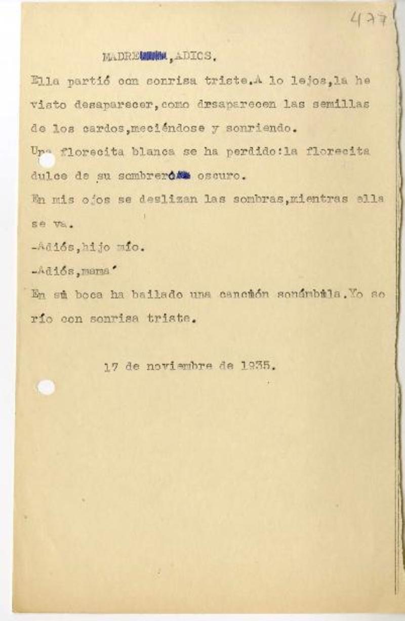 Adiós al cañaveral [manuscrito] Matilde Ladrón de Guevara.