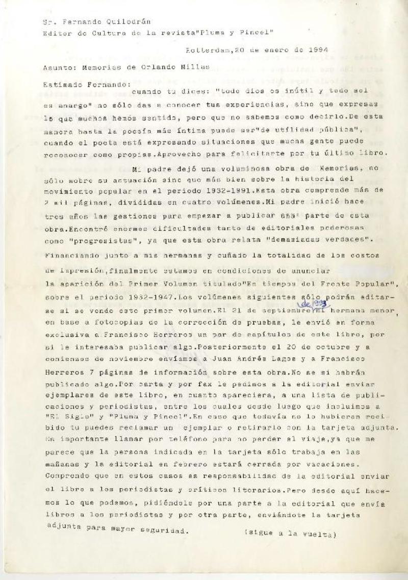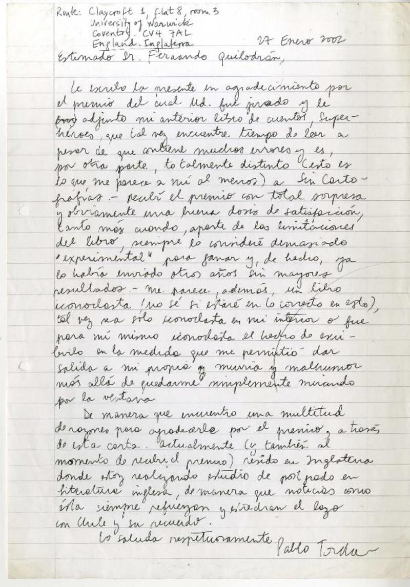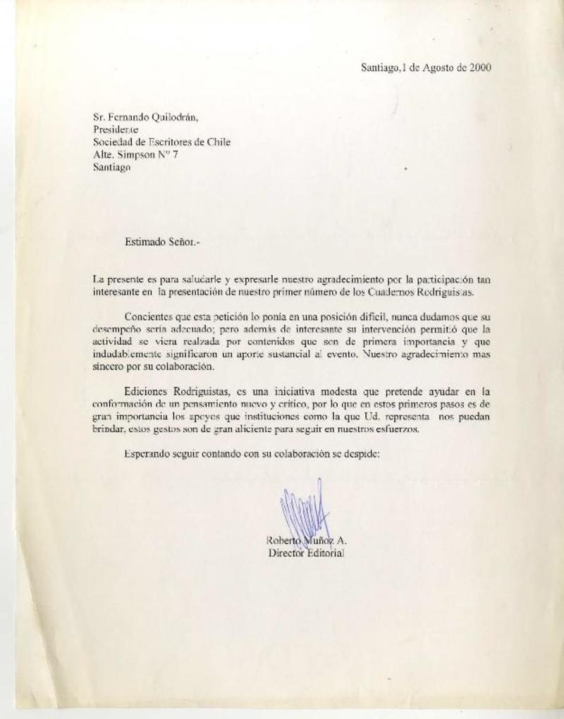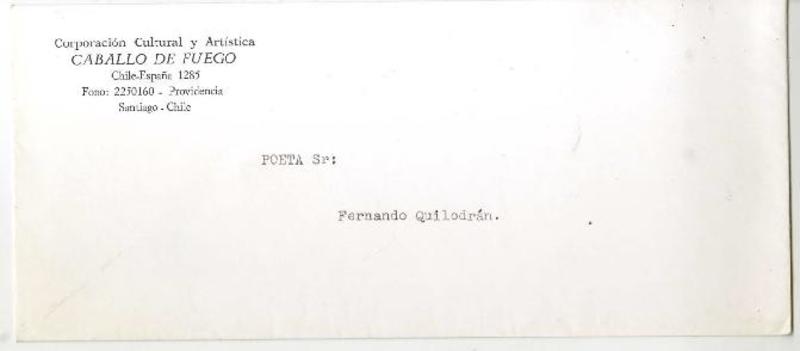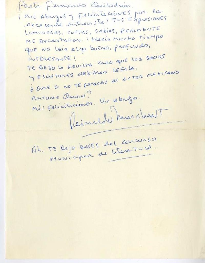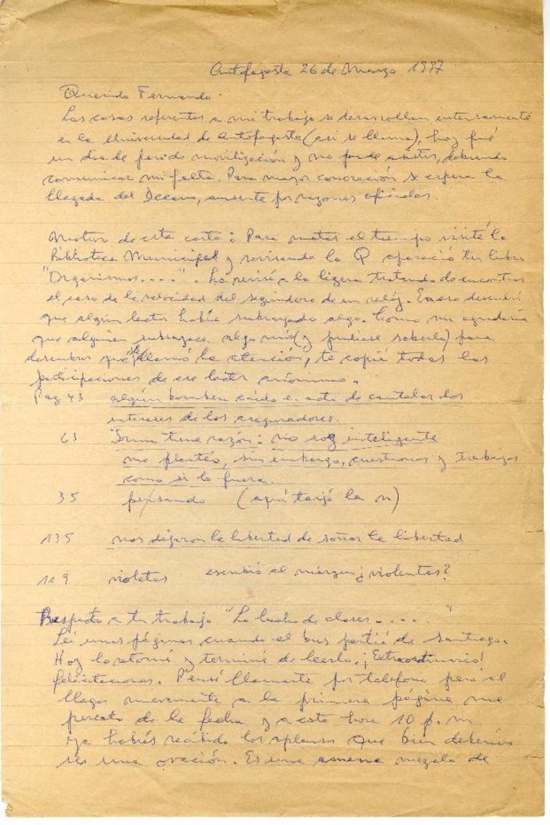 Antofagasta, Chile [a] Fernando Quilodrán, Chile Carta, 1997 mayo 26, [manuscrito] Federico Schopf.