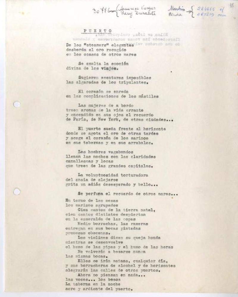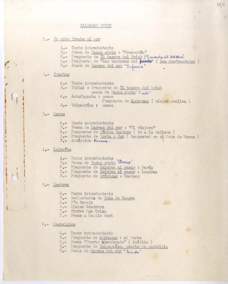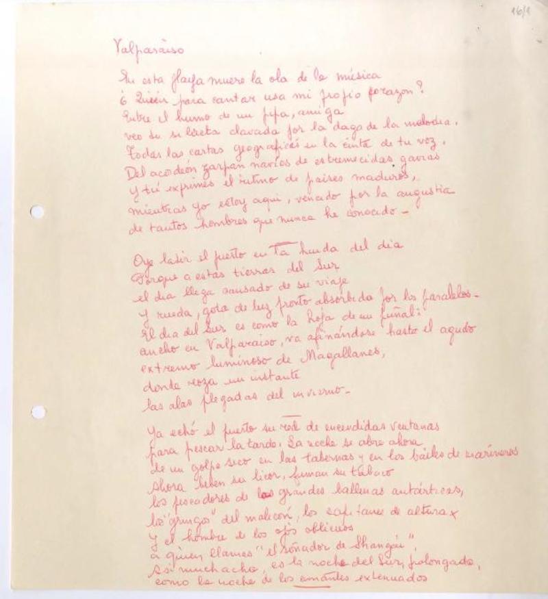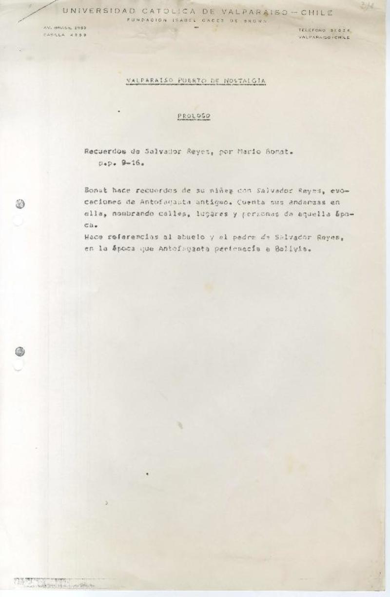 Valparaíso, puerto de nostalgía [fragmento] [manuscrito] Salvador Reyes ; prólogo de Mario Bonat.