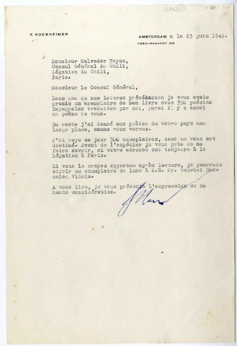 Amsterdam [a] Salvador Reyes, Paris, Francia Carta, 1949 junio 23, [manuscrito] F. Hochheimer.