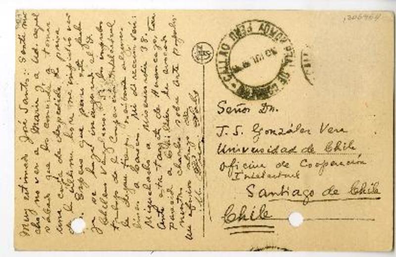 Valparaíso, Chile [a] Oscar Castro Tarjeta, 1938 diciembre 19, [manuscrito] Augusto d'Halmar.
