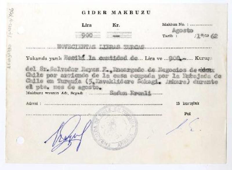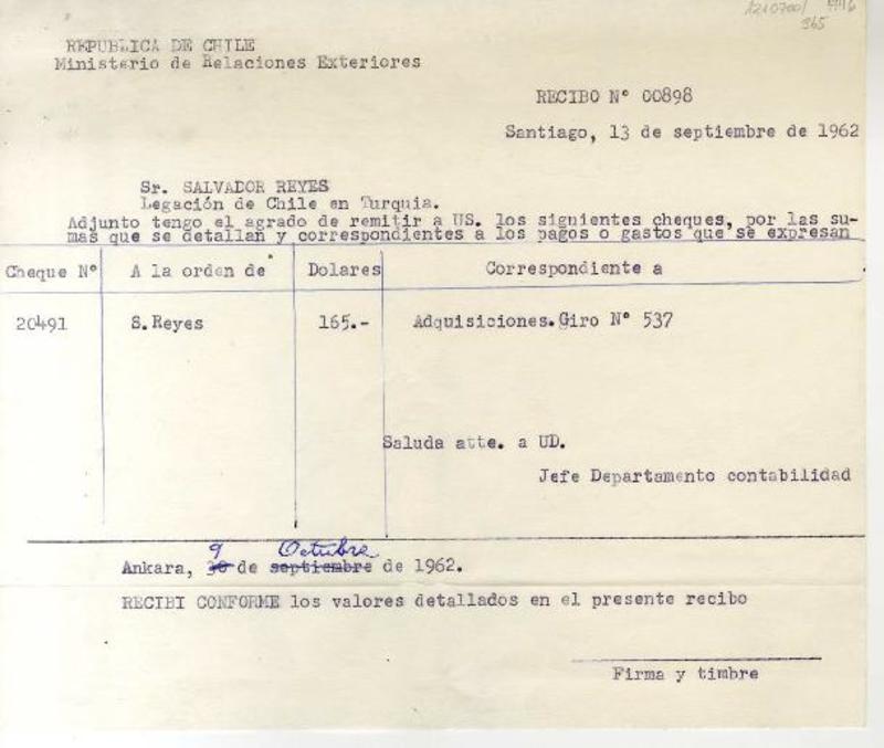 Ankara, Turquia [a] Ministerio de Relaciones Exteriores (Chile) Oficios, Entre agosto y diciembre de 1962, [manuscrito] Salvador Reyes.