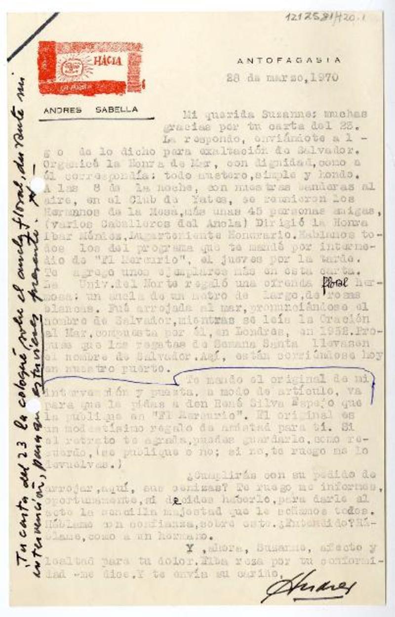 Antofagasta y Taltal, Chile [a] Suzanne Bertrand Cartas, Entre marzo y octubre de 1970, [manuscrito] Andrés Sabella.