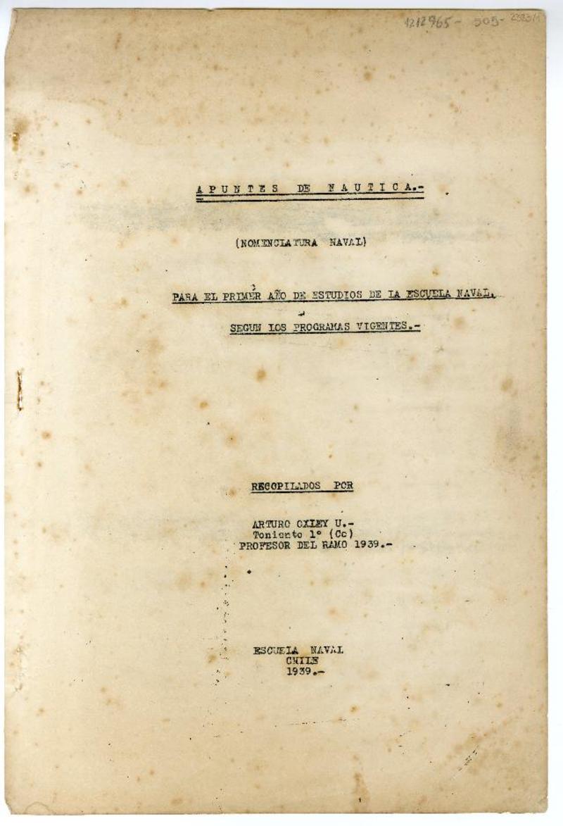 Apuntes de naútica : Para el primer año de estudios de la Escuela Naval [manuscrito] Recopilados por Arturo Oxley.