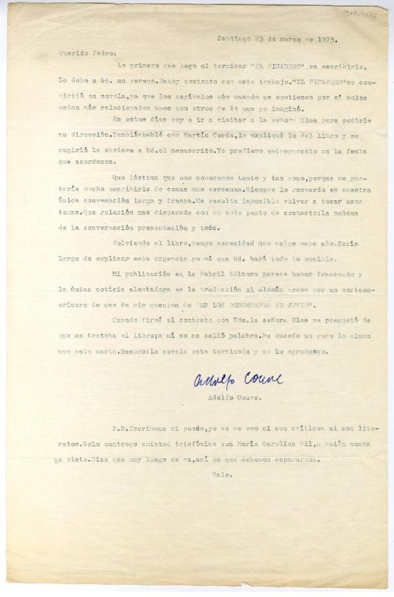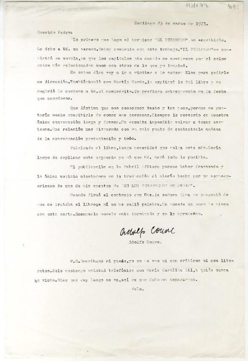 Santiago, Chile [a] Pedro Lastra Carta, 23 de marzo 1973, [manuscrito] Adolfo Couve.