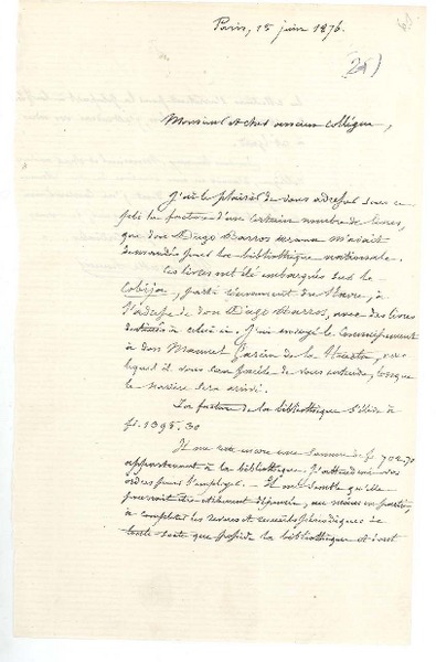 [Carta] 1876 jun. 15, París, Francia [a] Ramón Briseño [manuscrito] Jean Gustave Courcelle-Seneuil.