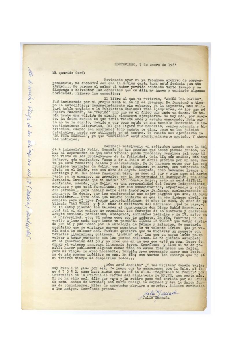 Montevideo, Uruguay [a] Pedro Lastra Carta, 7 de enero de 1963, [manuscrito] Julio Moncada.