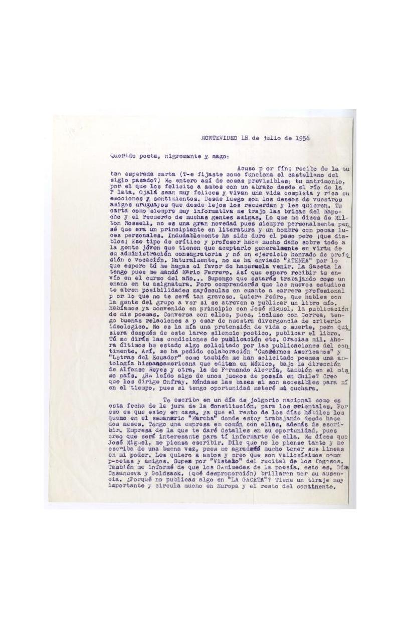 Montevideo, Uruguay [a] Pedro Lastra Carta, 18 de julio de 1956, [manuscrito] Julio Mondaca.