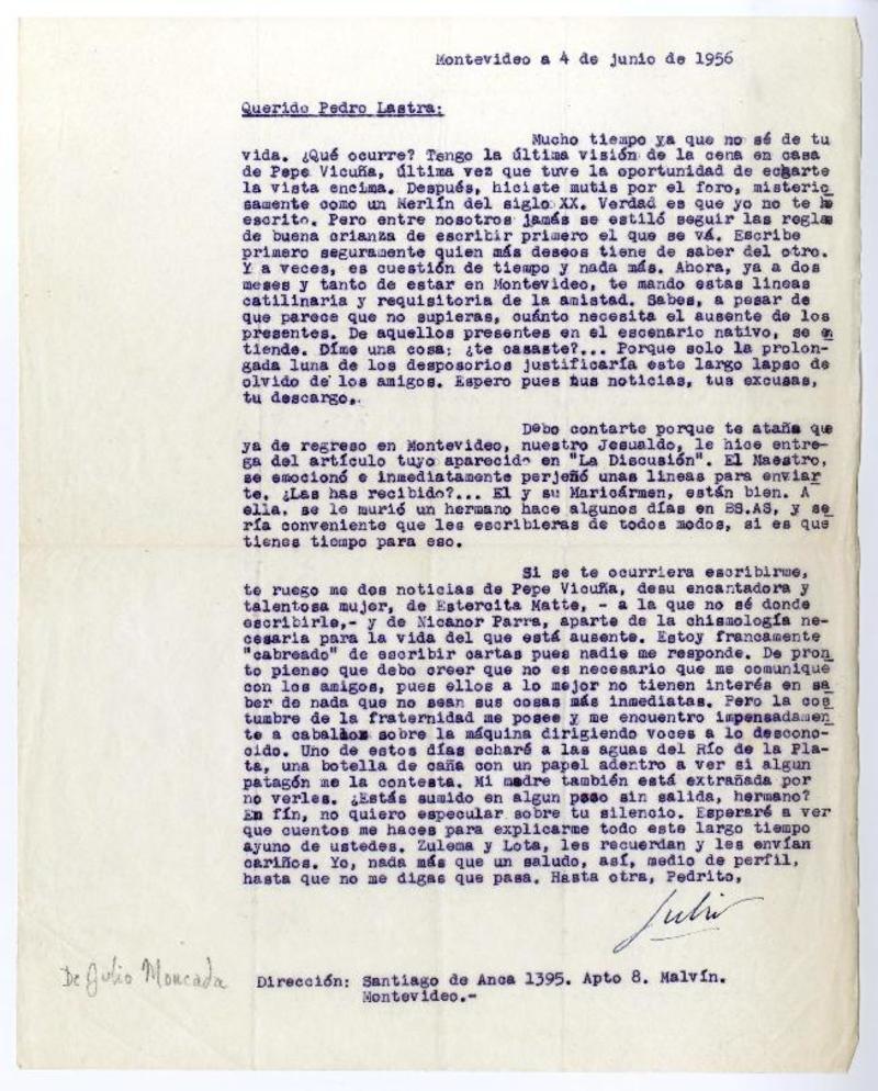 Montevideo, Uruguay [a] Pedro Lastra Carta, 4 de junio de 1956, [manuscrito] Julio Mondaca.