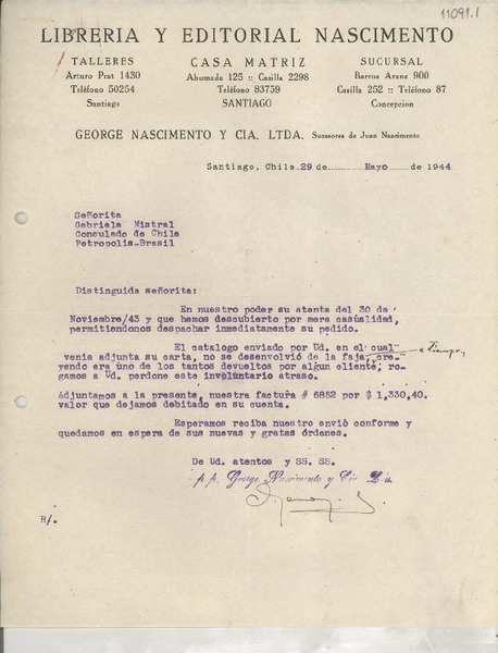 [Carta] 1944 mayo 29, Santiago, [Chile] [a] Gabriela Mistral, Consulado de Chile, Petrópolis, Brasil [manuscrito] [George Nascimento].