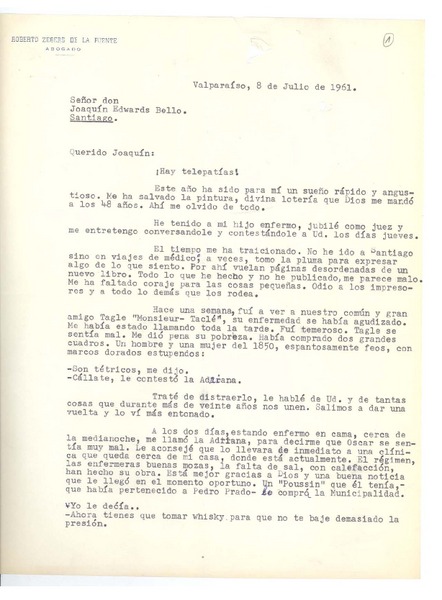[Carta] 1961 jun. 8, Valparaíso, Chile [a] Joaquín Edwards Bello [manuscrito] Roberto Zegers de la Fuente.