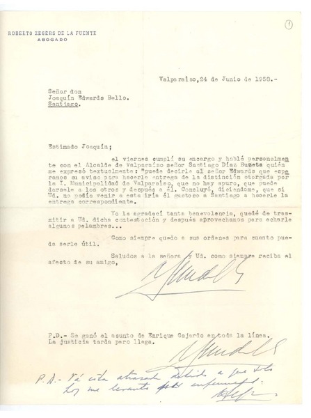 [Carta] 1958 jun. 24, Valparaíso, Chile [a] Joaquín Edwards Bello [manuscrito] Roberto Zegers de la Fuente.
