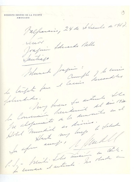 Zegers de la Fuente, Roberto - Correspondencia - Autores chilenos - Manuscritos chilenos - Edwards Bello, Joaquín