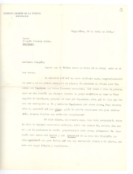 [Carta] 1958 abr. 28, Valparaíso, Chile [a] Joaquín Edwards Bello [manuscrito] Roberto Zegers de la Fuente.