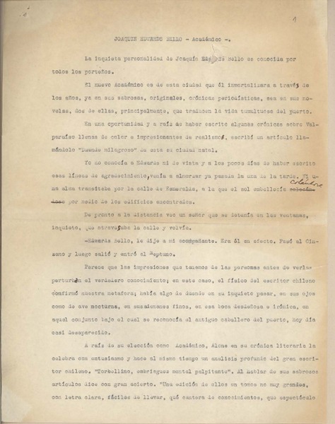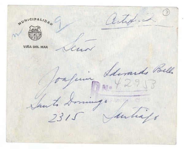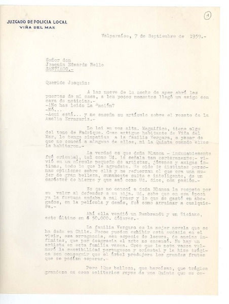 [Carta] 1959 sep. 7, Valparaíso, Chile [a] Joaquín Edwards Bello [manuscrito] Roberto Zegers de la Fuente.