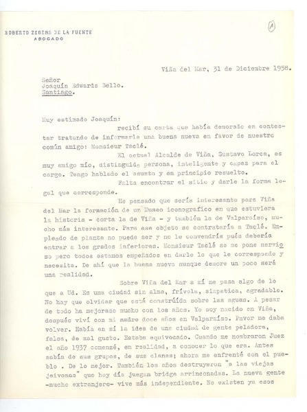 [Carta] 1958 dic. 31, Viña del Mar, Chile [a] Joaquín Edwards Bello [manuscrito] Roberto Zegers de la Fuente.