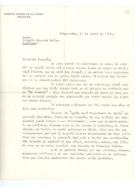 [Carta] 1958 abr. 11, Valparaíso, Chile [a] Joaquín Edwards Bello [manuscrito] Roberto Zegers de la Fuente.