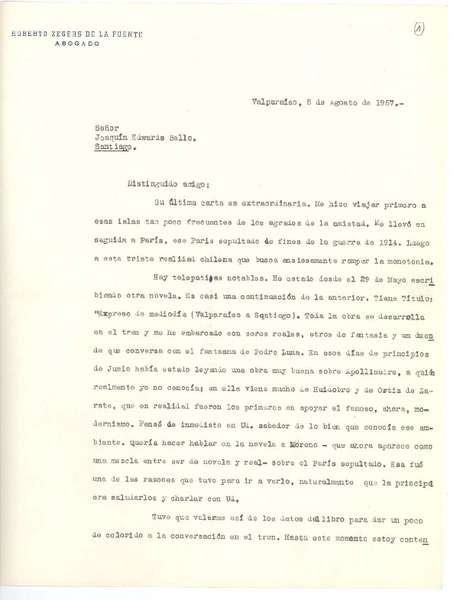 [Carta] 1957 ago. 5, Valparaíso, Chile [a] Joaquín Edwards Bello [manuscrito] Roberto Zegers de la Fuente.