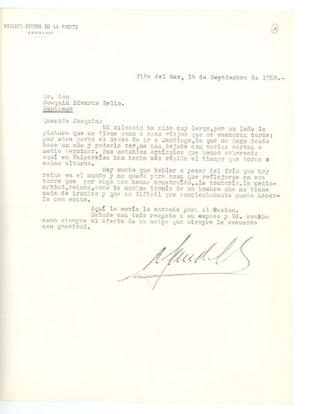 [Carta] 1960 sep. 14, Viña del Mar, Chile [a] Joaquín Edwards Bello [manuscrito] Roberto Zegers de la Fuente.