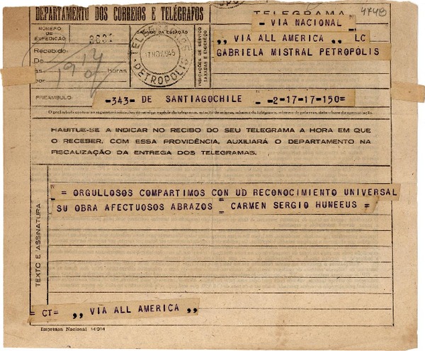 Mistral, Gabriela - Correspondencia - Manuscritos chilenos - Diplomáticos - Huneeus Lavín, Sergio