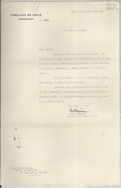 [Circular] N° 101, 1939 ene. 26, Washington [a] Srta. Lucila Godoy, Cónsul en Comisión, St. Augustine, Florida, E. U. de A. [manuscrito] Sergio Huneeus.