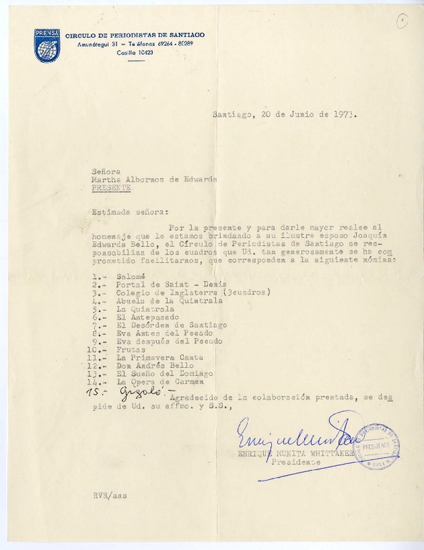 [Carta] 1973 junio 20, Santiago, [Chile][a] Marta Albornoz [manuscrito] Enrique Munita Whittaker.