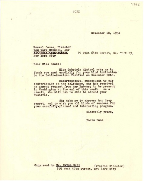 [Carta] 1954 nov. 18, [New York], [EE.UU.] [a] Marvel Cooke, New York, [EE.UU.] [manuscrito] Doris Dana.
