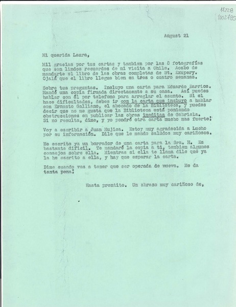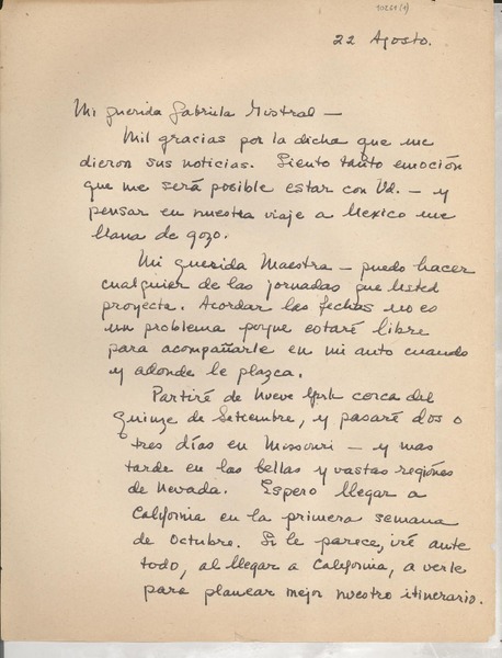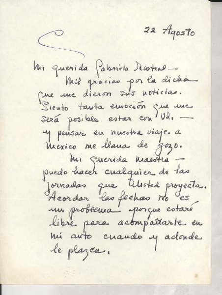 [Carta] 1948 ago. 22 [a] Gabriela Mistral [manuscrito] Doris Dana.