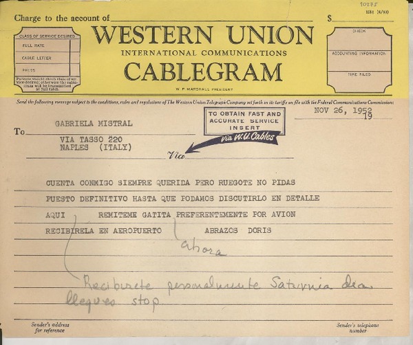[Telegrama] 1952 nov. 26 [a] Gabriela Mistral, Naples, Italy [manuscrito] Doris Dana.
