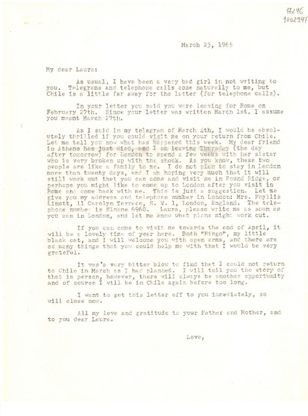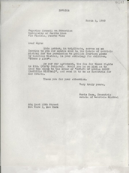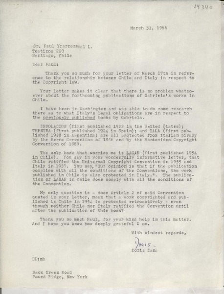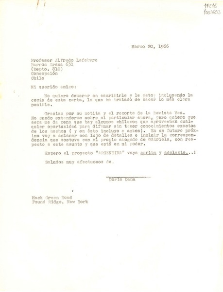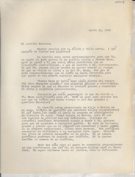 [Carta] 1948 Mar. 19, New York, [EE.UU.] [a] [Gabriela Mistral] [manuscrito] Doris Dana.